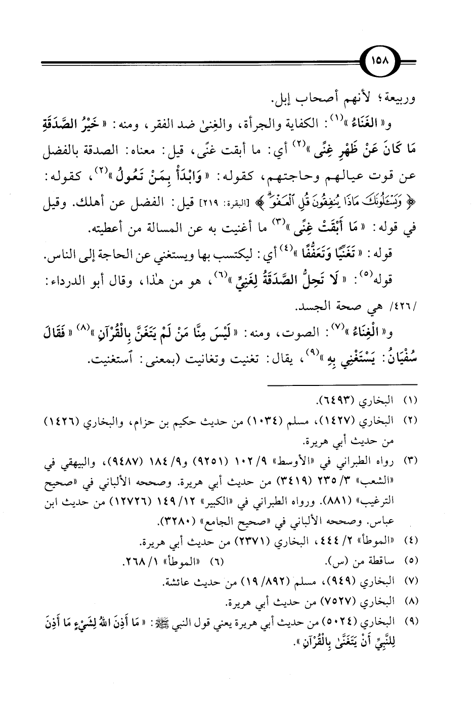 و"الغَنَاءُ" (¬1): الكفاية والجرأة، والغِنى ضد الفقر، ومنه: "خَيْرُ الصَّدَقَةِ مَا كَانَ عَنْ ظَهْرِ غِنًى" (¬2) أي: ما أبقت غنًى، قيل: معناه: الصدقة بالفضل عن قوت عيالهم وحاجتهم، كقوله: "وَابْدَأْ بِمَنْ تَعُولُ" (2)، كقوله: {وَيَسْأَلُونَكَ مَاذَا يُنْفِقُونَ قُلِ الْعَفْوَ} [البقرة: 219]، قيل: الفضل عن أهلك. وقيل في قوله: "مَا أَبْقَتْ غِنًى" (¬3) ما أغنيت به عن المسألة من أعطيته.