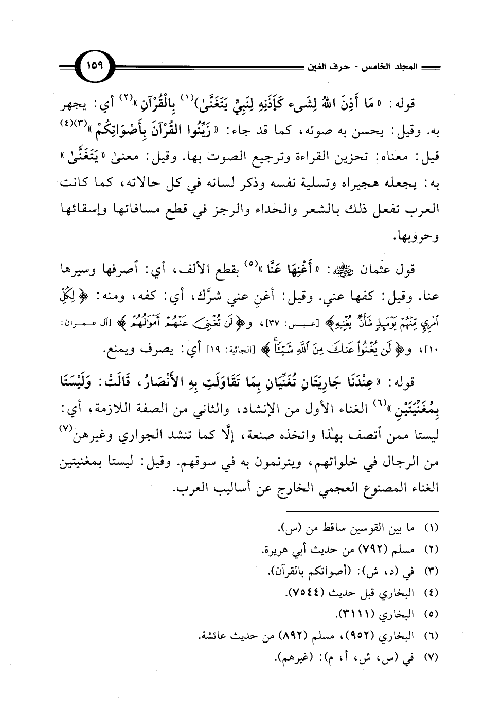 قوله: "عِنْدَنَا جَارِيَتَانِ تُغَنِّيَانِ بِمَا تَقَاوَلَتِ بِهِ الأَنْصَارُ، قَالَتْ: وَلَيْسَتَا بِمُغَنِّيَتَيْنِ" (¬6) الغناء الأول من الإنشاد، والثاني من الصفة اللازمة، أي: ليستا ممن اتصف بهذا واتخذه صنعة، إلاَّ كما تنشد الجواري وغيرهن (¬7) من الرجال في خلواتهم، ويترنمون به في سوقهم. وقيل: ليستا بمغنيتين الغناء المصنوع العجمي الخارج عن أساليب العرب.