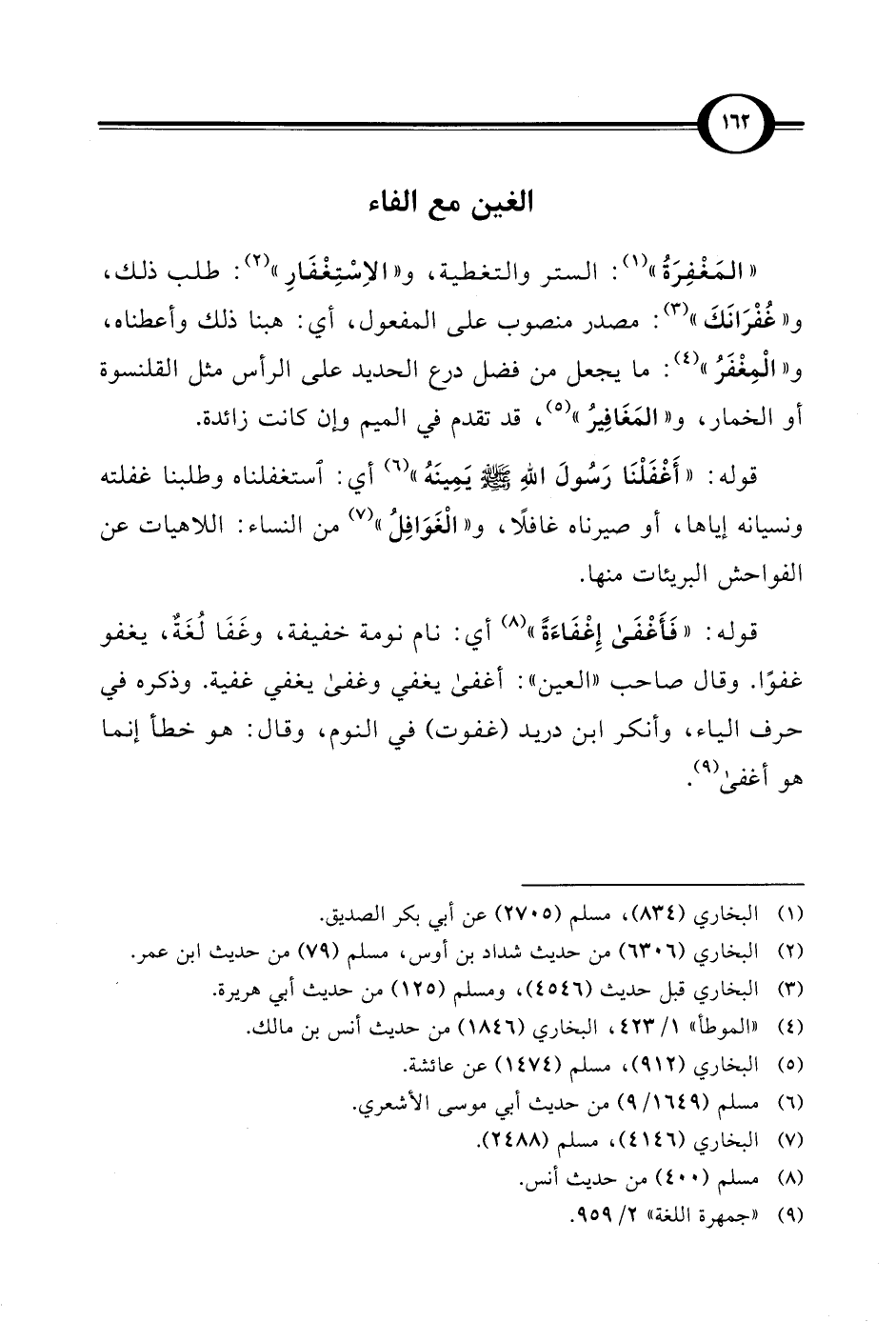 " المَغْفِرَةُ" (¬1): الستر والتغطية، و"الاِسْتِغْفَارِ" (¬2): طلب ذلك، و"غُفْرَانَكَ" (¬3): مصدر منصوب على المفعول، أي: هبنا ذلك وأعطناه، و"الْمِغْفَرُ" (¬4): ما يجعل من فضل درع الحديد على الرأس مثل القلنسوة أو الخمار، و"المَغَافِيرُ" (¬5)، قد تقدم في الميم وإن كانت زائدة.