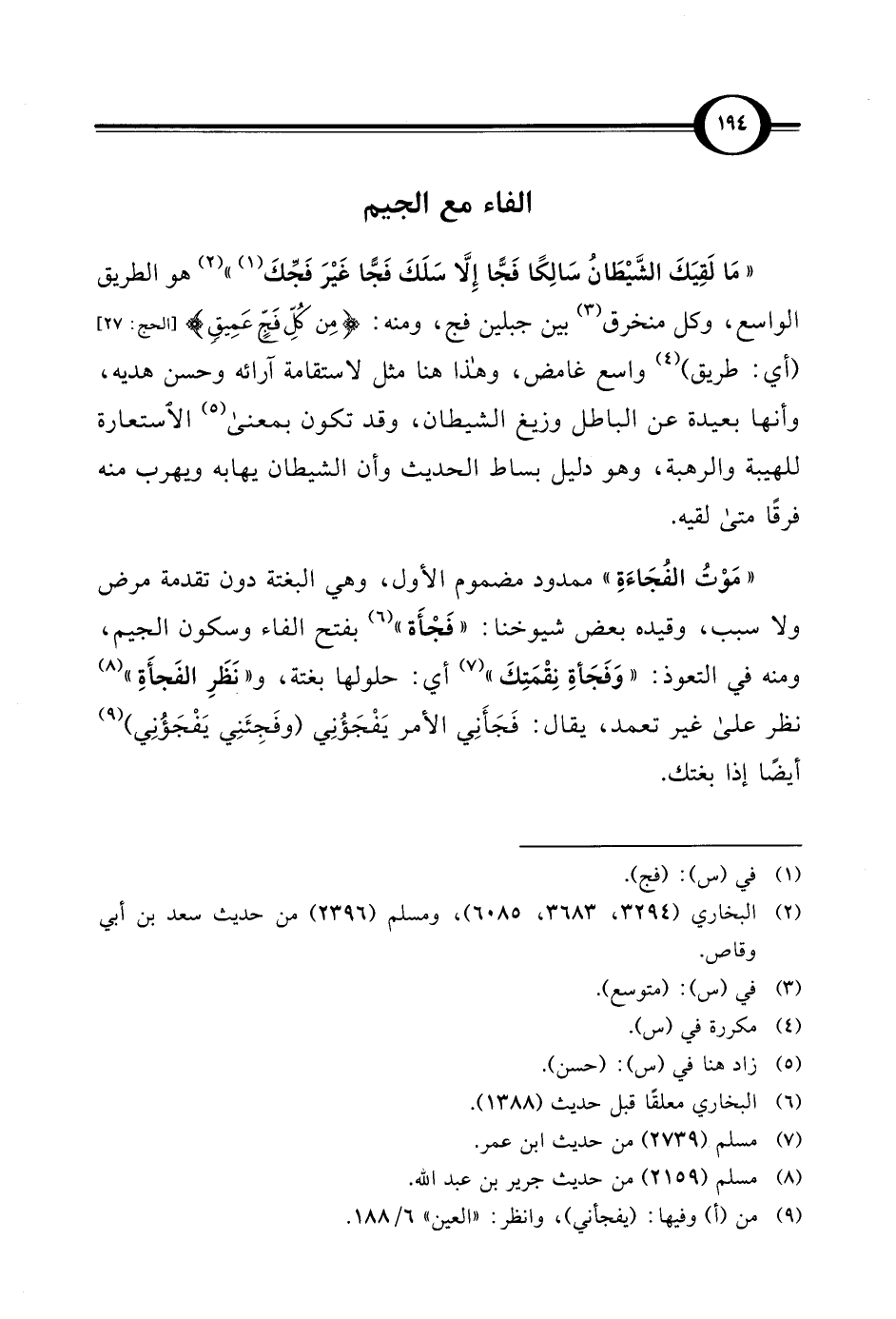 "مَوْتُ الفُجَاءَةِ" ممدود مضموم الأول، وهي البغتة دون تقدمة مرض ولا سبب، وقيده بعض شيوخنا: "فَجْأَة" (¬6) بفتح الفاء وسكون الجيم، ومنه في التعوذ: "وَفَجَأةِ نِقْمَتِكَ" (¬7) أي: حلولها بغتة، و"نَظَرِ الفَجأَةِ" (¬8) نظر على غير تعمد، يقال: فَجَأَنِي الأمر يَفْجَؤُنِي (وفَجِئَنِي يَفْجَؤُنِي) (¬9) أيضاً إذا بغتك.
