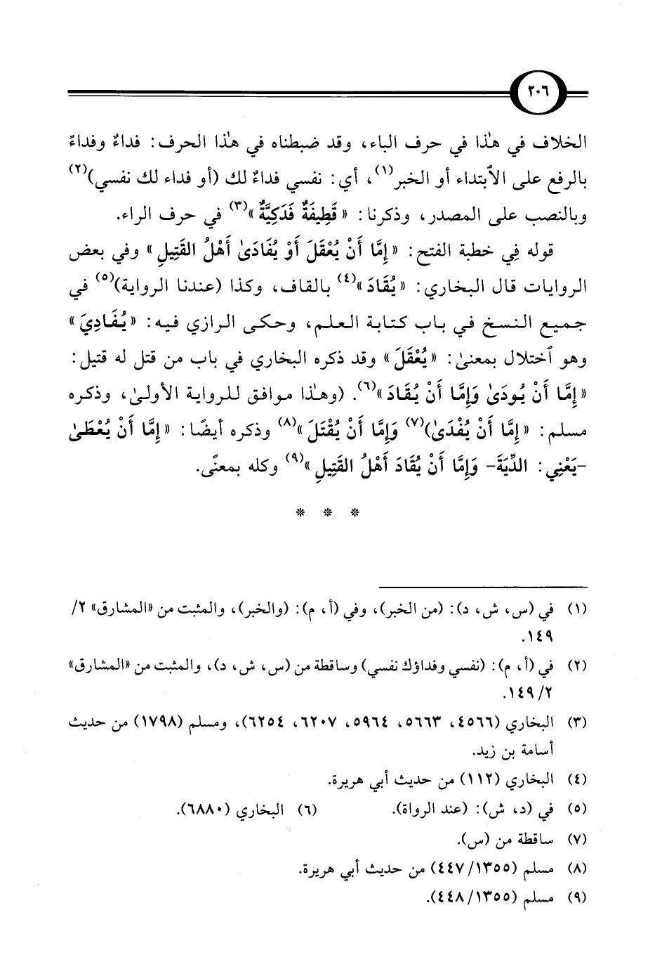 قوله في خطبة الفتح: "إِمَّا أَنْ يُعْقَلَ أَوْ يُفَادَى أَهْلُ القَتِيلِ" وفي بعض الروايات قال البخاري: "يُقَادَ" (¬4) بالقاف، وكذا (عندنا الرواية) (¬5) في جميع النسخ في باب كتابة العلم، وحكى الرازي فيه: "يُفَادِيَ" وهو اختلال بمعنى: "يُعْقَلَ" وقد ذكره البخاري في باب من قتل له قتيل: "إِمَّا أَنْ يُودَى وَإِمَّا أَنْ يُقَادَ" (¬6). (وهذا موافق للرواية الأولى، وذكره مسلم: "إِمَّا أَنْ يُفْدَى) (¬7) وَإِمَّا أَنْ يُقْتَلَ" (¬8) وذكره أيضًا: "إِمَّا أَنْ يُعْطَى - يَعْنِي: الدّيَةَ - وَإِمَّا أَنْ يُقَادَ أَهْلُ القَتِيلِ" (¬9) وكله بمعنى.