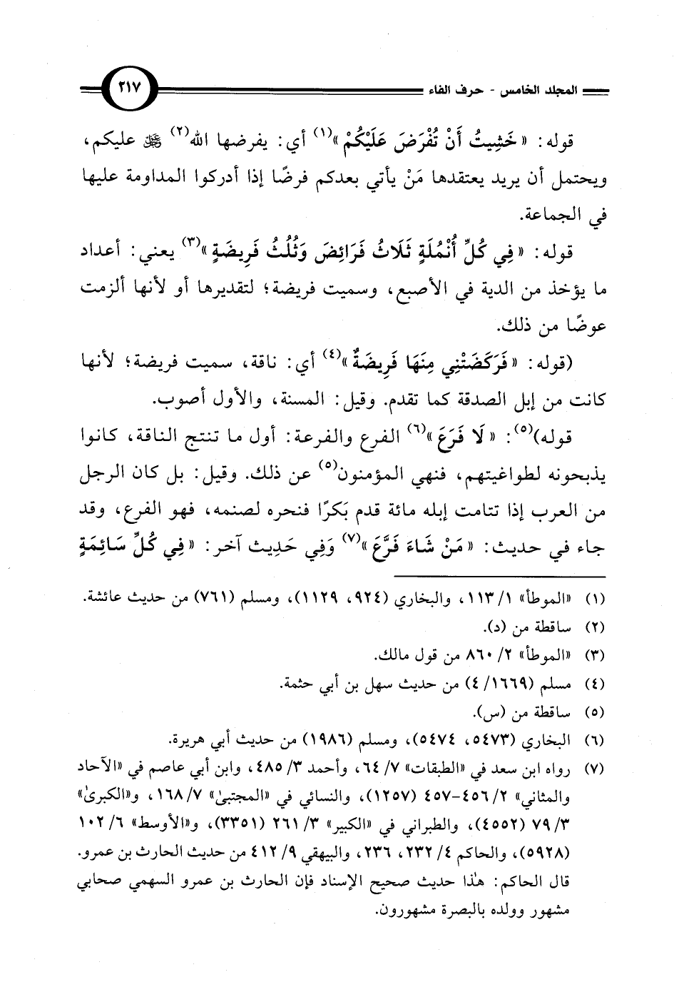 قوله) (¬5): "لَا فَرَعَ" (¬6) الفرع والفرعة: أول ما تنتج الناقة، كانوا يذبحونه لطواغيتهم، فنهي المؤمنون (5) عن ذلك. وقيل: بل كان الرجل من العرب إذا تتامت إبله مائة قدم بَكرًا فنحره لصنمه، فهو الفرع، وقد جاء في حديث: "مَنْ شَاءَ فَرَّعَ" (¬7) وَفِي حَدِيث آخر: "في كُلِّ سَائِمَةٍ