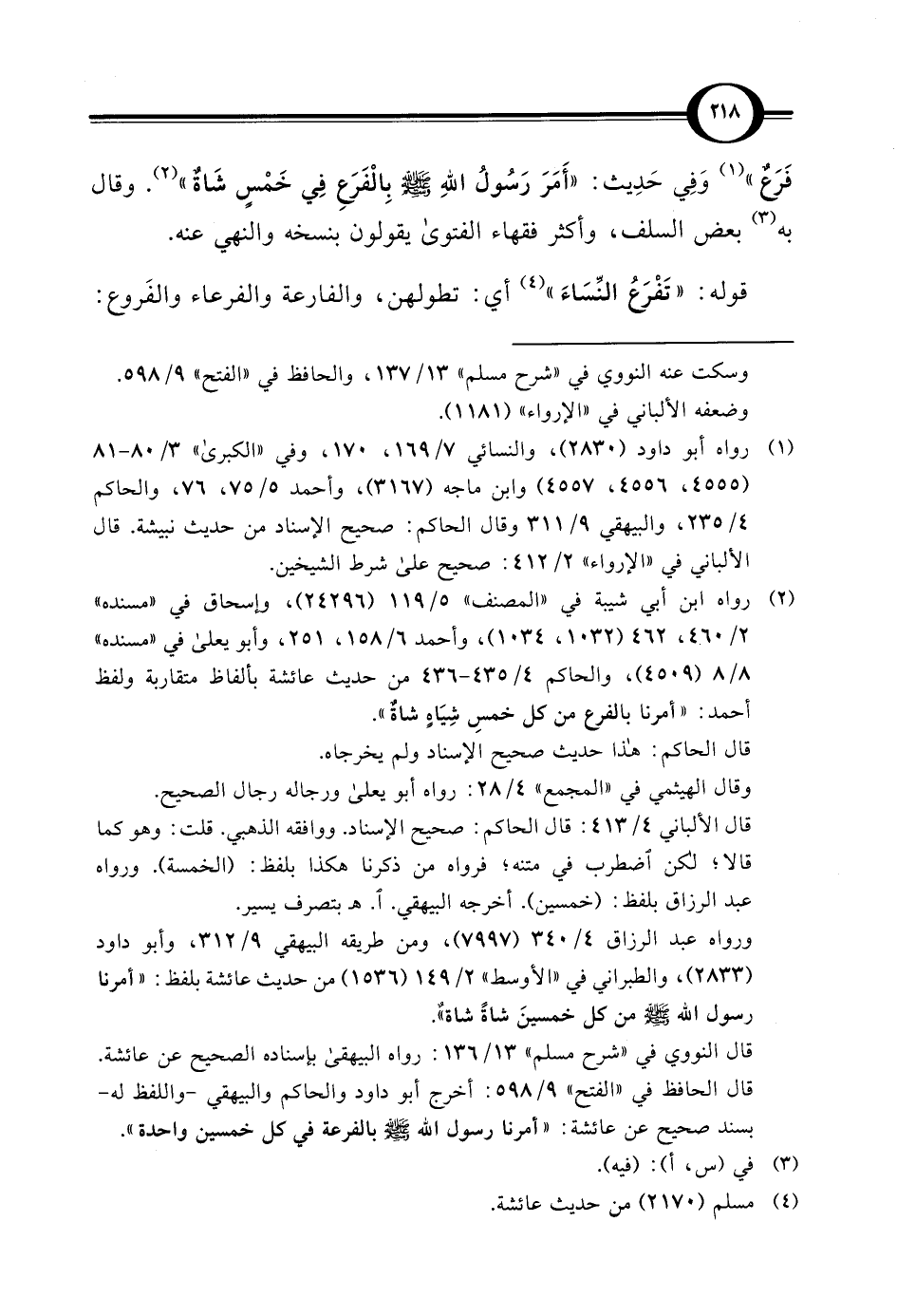 (¬2) رواه ابن أبي شيبة في "المصنف" 5/ 119 (24296)، وإسحاق في "مسنده" 2/ 460، 462 (1032، 1034)، وأحمد 6/ 158، 251، وأبو يعلي في "مسنده" 8/ 8 (4509)، والحاكم 4/ 435 - 436 من حديث عائشة بألفاظ متقاربة ولفظ أحمد: "أمرنا بالفرع من كل خمسِ شِيَاهٍ شاةٌ". قال الحاكم: هذا حديث صحيح الإسناد ولم يخرجاه. وقال الهيثمي في "المجمع" 4/ 28: رواه أبو يعلي ورجاله رجال الصحيح. قال الألباني 4/ 413: قال الحاكم: صحيح الإسناد. ووافقه الذهبي. قلت: وهو كما قالا؛ لكن اضطرب في متنه؛ فرواه من ذكرنا هكذا بلفظ. (الخمسة). ورواه عبد الرزاق بلفظ: (خمسين). أخرجه البيهقي. ا. هـ بتصرف يسير. ورواه عبد الرزاق 4/ 340 (7997)، ومن طريقه البيهقي 9/ 312، وأبو داود (2833)، والطبراني في "الأوسط" 2/ 149 (1536) من حديث عائشة بلفظ: "أمرنا رسول الله - صلى الله عليه وسلم - من كل خمسينَ شاةً شاةٌ". قال النووي في "شرح مسلم" 13/ 136: رواه البيهقي بإسناده الصحيح عن عائشة. قال الحافظ في "الفتح" 9/ 598: أخرج أبو داود والحاكم والبيهقي - واللفظ له - بسند صحيح عن عائشة: "أمرنا رسول الله - صلى الله عليه وسلم - بالفرعة في كل خمسين واحدة".