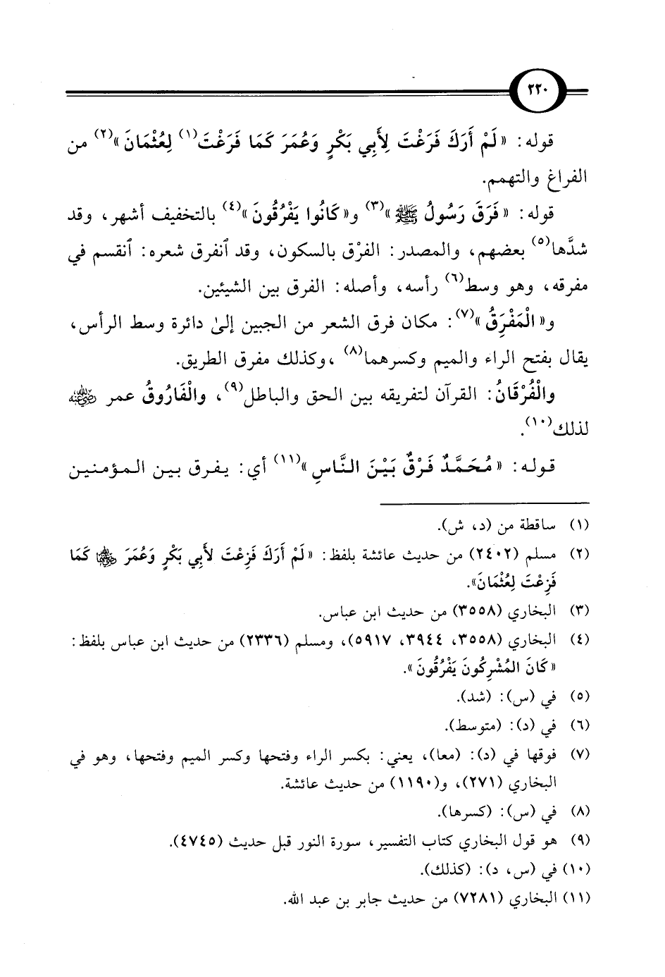 قوله: "فَرَقَ رَسُولُ - صلى الله عليه وسلم -" (¬3) و"كَانُوا يَفْرُقُونَ" (¬4) بالتخفيف أشهر، وقد شدَّها (¬5) بعضهم، والمصدر: الفرْق بالسكون، وقد انفرق شعره: انقسم في مفرقه، وهو وسط (¬6) رأسه، وأصله: الفرق بين الشيئين.