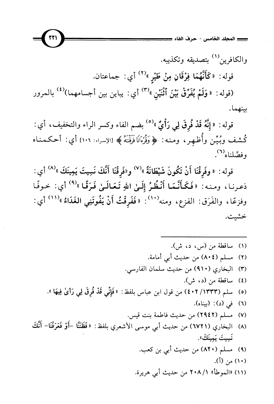 قوله: "وفَرِقْنَا أَنْ تكونَ شَيْطَانَةً" (¬7) و"فَرِقْنَا أَنَّكَ نَسِيتَ يَمِينَكَ" (¬8) أي: ذعرنا، ومنه: "فَكَأَنَّمَا أَنْظُرُ إلى اللهِ تَعَالَي فَرَقًا" (¬9) أي: خوفًا وفزعًا، والفَرَق: الفزع، ومنه (¬10): "فَفَرِقْتُ أَنْ يَفُوتَنِي الغَدَاءُ" (¬11) أي: خشيت.