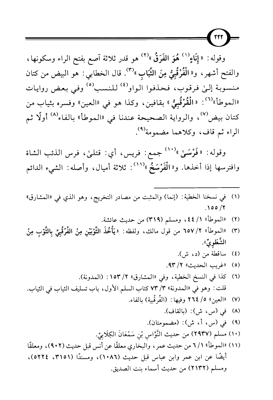 وقوله: "إِنَاءٍ (¬1) هُوَ الفَرَقُ" (¬2) هو قدر ثلاثة آصع بفتح الراء وسكونها، والفتح أشهر، و"الْفُرْقُبِيُّ مِنَ الثّيَابِ" (¬3). قال الخطابي: هو البيض من كتان منسوبة إلى فرقوب، فحذفوا الواو (¬4) للنسب (¬5) وفي بعض روايات "الموطأ" (¬6): "الْقُرْقُبِيُّ" بقافين، وكذا هو في "العين" وفسره بثياب من كتان بيض (¬7)، والرواية الصحيحة عندنا في "الموطأ" بالفاء (¬8) أولاً ثم الراء ثم قاف، وكلاهما مضمومة (¬9).