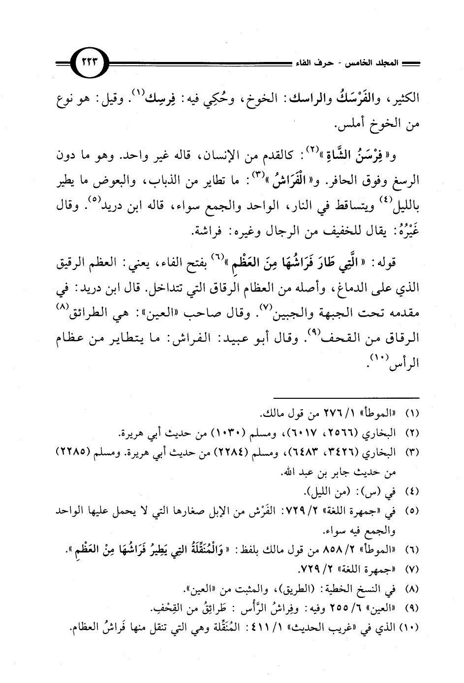 و"فِرْسَنُ الشَّاةِ" (¬2): كالقدم من الإنسان، قاله غير واحد. وهو ما دون الرسغ وفوق الحافر. و"الْفَرَاشُ" (¬3): ما تطاير من الذباب، والبعوض ما يطير بالليل (¬4) ويتساقط في النار، الواحد والجمع سواء، قاله ابن دريد (¬5). وقال غَيْرُهُ: يقال للخفيف من الرجال وغيره: فراشة.