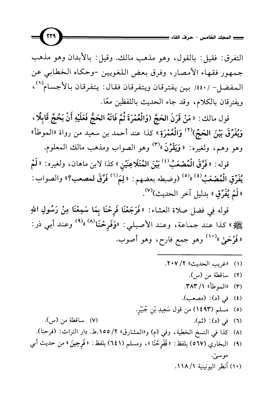 قول مالك: "مَنْ قَرَنَ الحَجَّ (وَالْعُمْرَةَ ثُمَّ فَاتَهُ الحَجُّ فَعَلَيْهِ أَنْ يَحُجَّ قَابِلاً، وَيُفَرِّقَ بَيْنَ الحَجِّ) (¬2) وَالْعُمْرَةِ" كذا عند أحمد بن سعيد من رواة "الموطأ" وهو وهم، ولغيره: "وَيَقْرُنَ" (¬3) وهو الصواب ومذهب مالك المعلوم.
