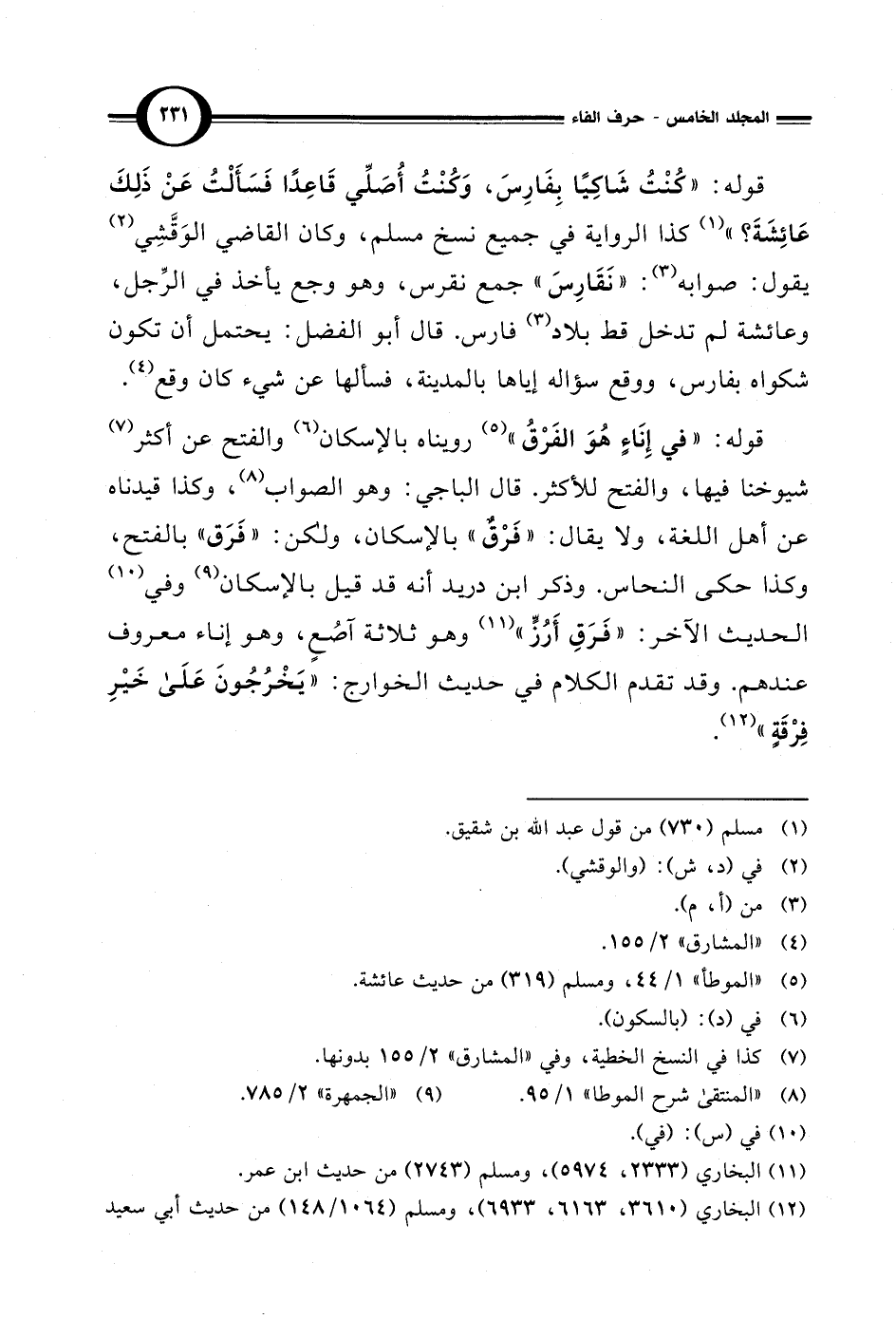 قوله: "في إِنَاءٍ هُوَ الفَرْقُ" (¬5) رويناه بالإسكان (¬6) والفتح عن أكثر (¬7) شيوخنا فيها، والفتح للأكثر. قال الباجي: وهو الصواب (¬8)، وكذا قيدناه عن أهل اللغة، ولا يقال: "فَرْقٌ" بالإسكان، ولكن: "فَرَق" بالفتح، وكذا حكى النحاس. وذكر ابن دريد أنه قد قيل بالإسكان (¬9) وفي (¬10) الحديث الآخر: "فَرَقِ أَرُزٍّ" (¬11) وهو ثلاثة آصُعٍ، وهو إناء معروف عندهم. وقد تقدم الكلام في حديث الخوارج: "يَخْرُجُونَ عَلَي خَيْرِ فِرْقَةٍ" (¬12).