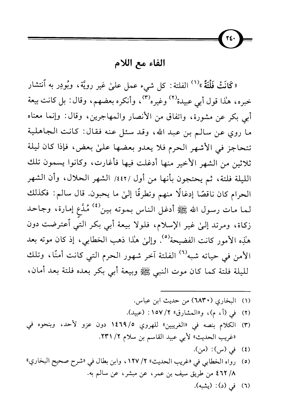 " كَانَتْ فَلْتَةً" (¬1) الفلتة: كل شيء عمل علي غير رويَّة، وبُودِر به انتشار خبره، هذا قول أبي عبيدة (¬2) وغيره (¬3)، وأنكره بعضهم، وقال: بل كانت بيعة أبي بكر عن مشورة، واتفاق من الأنصار والمهاجرين، وقال: وإنما معناه ما روي عن سالم بن عبد الله، وقد سئل عنه فقال: كانت الجاهلية تتحاجز في الأشهر الحرم فلا يعدو بعضها علي بعض، فإذا كان ليلة ثلاثين من الشهر الأخير منها أدغلت فيها فأغارت، وكانوا يسمون تلك الليلة فلتة، ثم يحتجون بأنها من أول الشهر الحلال، وأن الشهر الحرام كان ناقصًا إدغالًا منهم وتطرقًا إلى ما يحبون. قال سالم: فكذلك لما مات رسول الله - صلى الله عليه وسلم - أدغل الناس بموته بين (¬4) مُدَّعٍ إمارة، وجاحد زكاة، ومرتد إلى غير الإِسلام، فلولا بيعة أبي بكر التي اعترضت دون هذه الأمور كانت الفضيحة (¬5). وإلى هذا ذهب الخطابي، إذ كان موته بعد الأمن في حياته شبه (¬6) الفلتة آخر شهور الحرم التي كانت أمنًا، وتلك لليلة فلتة كما كان موت النبي - صلى الله عليه وسلم - وبيعة أبي بكر بعده فلتة بعد أمان،