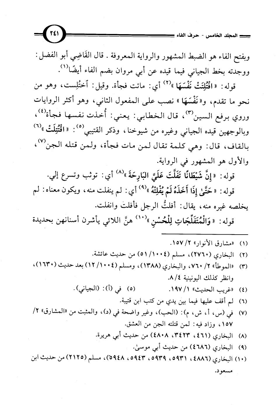 قوله: "افْتُلِتَتْ نَفْسَهَا" (¬2) أي: ماتت فجأة. وقيل: اختُلِست، وهو من نحو ما تقدم، و"نَفْسَهَا" نصب على المفعول الثاني، وهو أكثر الروايات وروي برفع السين (¬3)، قال الخطابي: يعني: أُخذت نفسها فجأة (¬4)، وبالوجهين قيده الجياني وغيره من شيوخنا، وذكر القتيبي (¬5): "اقْتُتِلَتْ" (¬6) بالقاف، قال: وهي كلمة تقال لمن مات فجأة، ولمن قتله الجن (¬7)، والأول هو المشهور في الرواية.