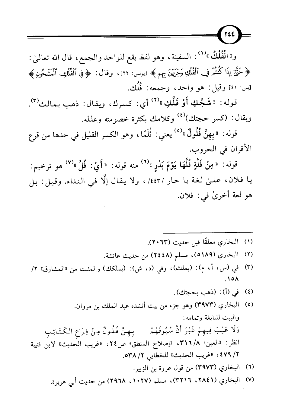 قوله: "مِنْ فَلَّةٍ فُلَّهَا يَوْمَ بَدرٍ" (¬6) منه قوله: "أَيْ: فُلُ" (¬7) هو ترخيم: يا فلان، علي لغة يا حار، ولا يقال إلاَّ في النداء. وقيل: بل هو لغة أخري في: فلان.