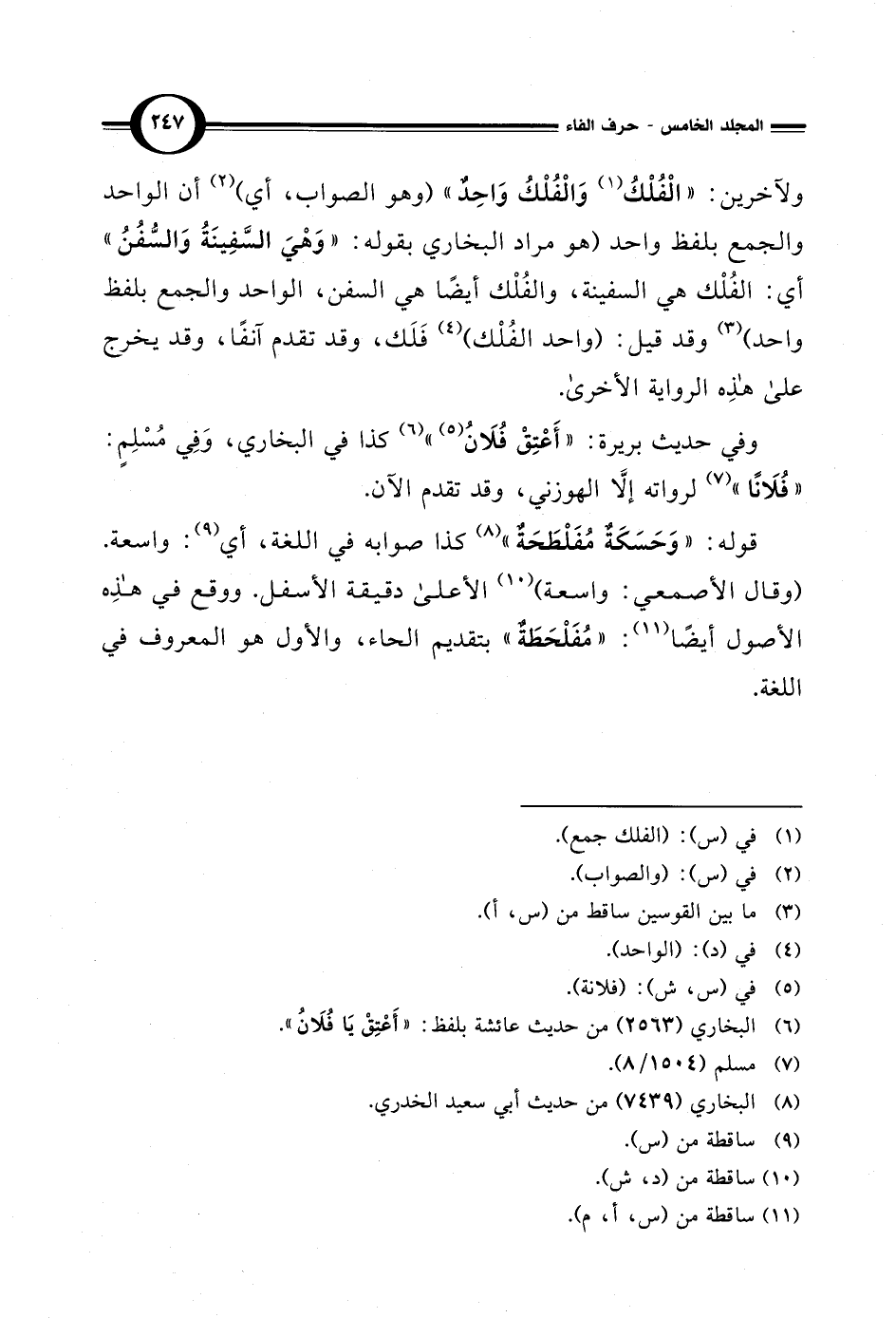 (وقال الأصمعي: واسعة) (¬10) الأعلى دقيقة الأسفل. ووقع في هذه الأصول أيضًا (¬11): "مُفَلْحَطَةٌ" بتقديم الحاء، والأول هو المعروف في اللغة.