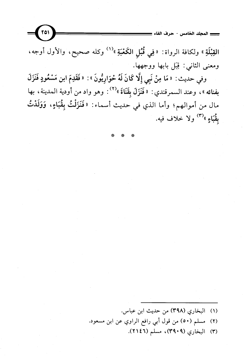 وفي حديث: "مَا مِنْ نَبِي إِلَّا كانَ لَهُ حْوَارِيُّونَ": "فَقَدِمَ ابن مَسْعُودٍ فَنَزَلَ بفنائه"، وعند السمرقندي: "فَنَزَلَ بِقَنَاةَ" (¬2): وهو واد من أودية المدينة، بها مال من أموالهم؛ وأما الذي في حديث أسماء: "فَنَزَلْتُ بِقُبَاءٍ، وَوَلَدْتُ بِقُبَاءٍ" (¬3) ولا خلاف فيه.