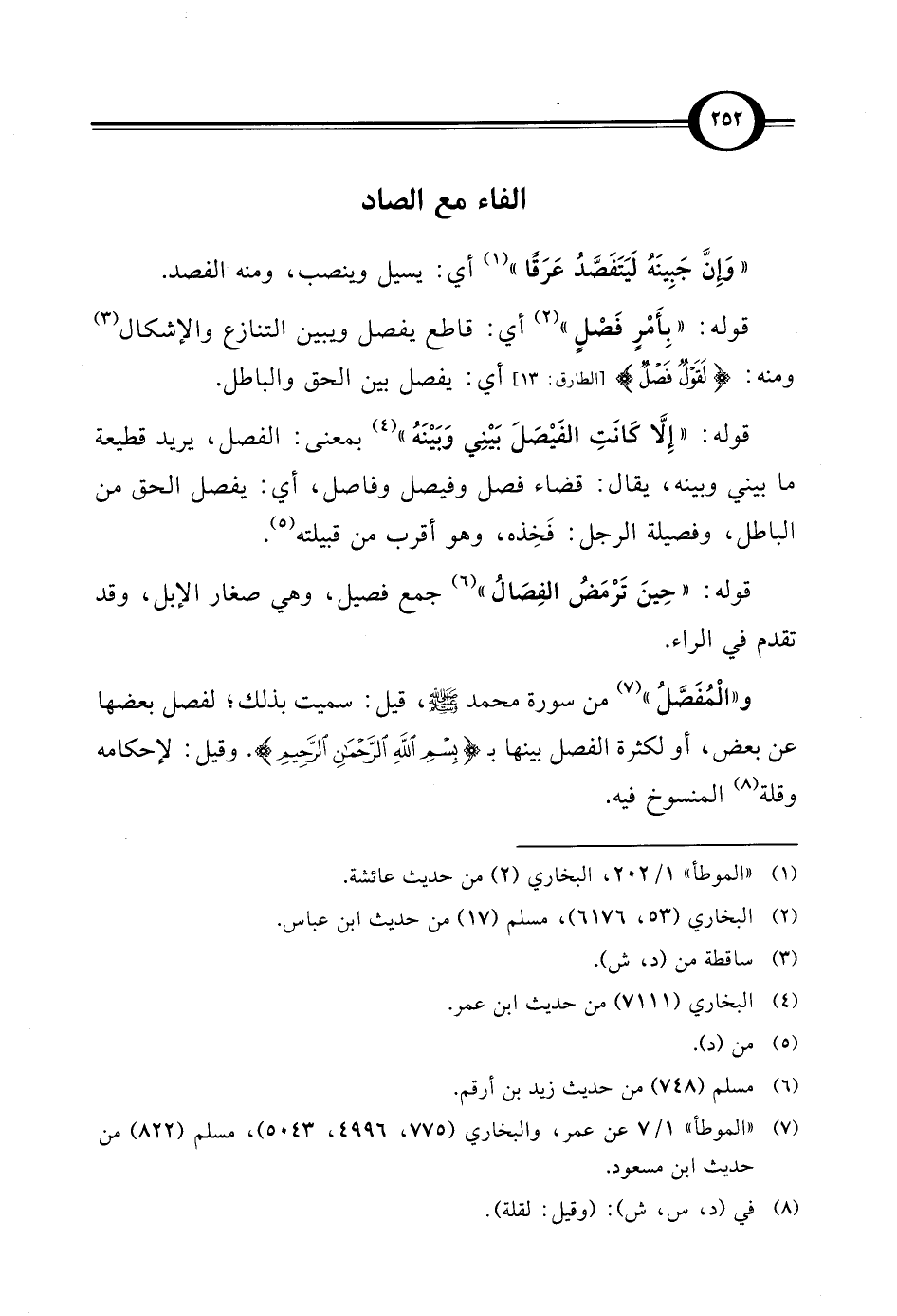 و"الْمُفَصَّلُ" (¬7) من سورة محمَّد - صلى الله عليه وسلم - , قيل: سميت بذلك؛ لفصل بعضها عن بعض، أو لكثرة الفصل بينها بـ {بِسْمِ اللهِ الرَّحْمَنِ الرَّحِيمِ}. وقيل: لإحكامه وقلة (¬8) المنسوخ فيه.