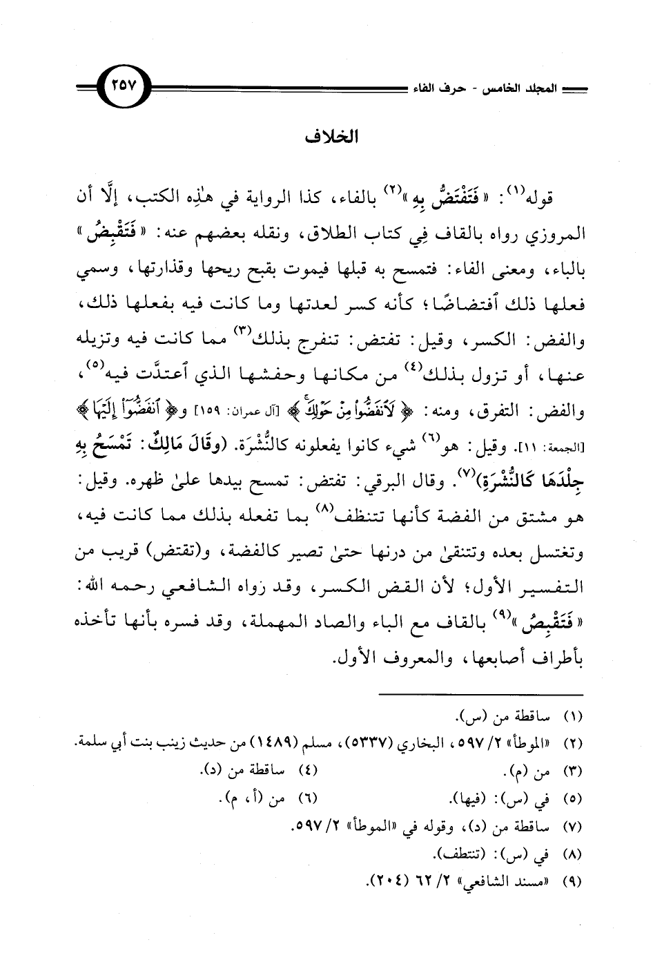 قوله (¬1): "فَتَفْتَضُّ به" (¬2) بالفاء، كذا الرواية في هذه الكتب، إلاَّ أن المروزي رواه بالقاف في كتاب الطلاق، ونقله بعضهم عنه: "فَتَقْبِضُ" بالباء، ومعنى الفاء: فتمسح به قبلها فيموت بقبح ريحها وقذارتها، وسمي فعلها ذلك افتضاضًا؛ كأنه كسر لعدتها وما كانت فيه بفعلها ذلك، والفض: الكسر، وقيل: تفتض: تنفرج بذلك (¬3) مما كانت فيه وتزيله عنها، أو تزول بذلك (¬4) من مكانها وحفشها الذي اعتدَّت فيه (¬5)، والفض: التفرق، ومنه: {لَانْفَضُّوا مِنْ حَوْلِكَ} [آل عمران: 159] و {انْفَضُّوا إِلَيْهَا} [الجمعة: 11]. وقيل: هو (¬6) شيء كانوا يفعلونه كالنُّشْرَة. (وقَالَ مَالِكٌ: تَمْسَحُ بِهِ جِلْدَهَا كَالنُّشْرَةِ) (¬7). وقال البرقي: تفتض: تمسح بيدها علي ظهره. وقيل: هو مشتق من الفضة كأنها تتنظف (¬8) بما تفعله بذلك مما كانت فيه، وتغتسل بعده وتتنقي من درنها حتي تصير كالفضة، و (تقتض) قريب من التفسير الأول؛ لأن القض الكسر، وقد رواه الشافعي رحمه الله: "فَتَقْبِصُ" (¬9) بالقاف مع الباء والصاد المهملة، وقد فسره بأنها تأخذه بأطراف أصابعها، والمعروف الأول.
