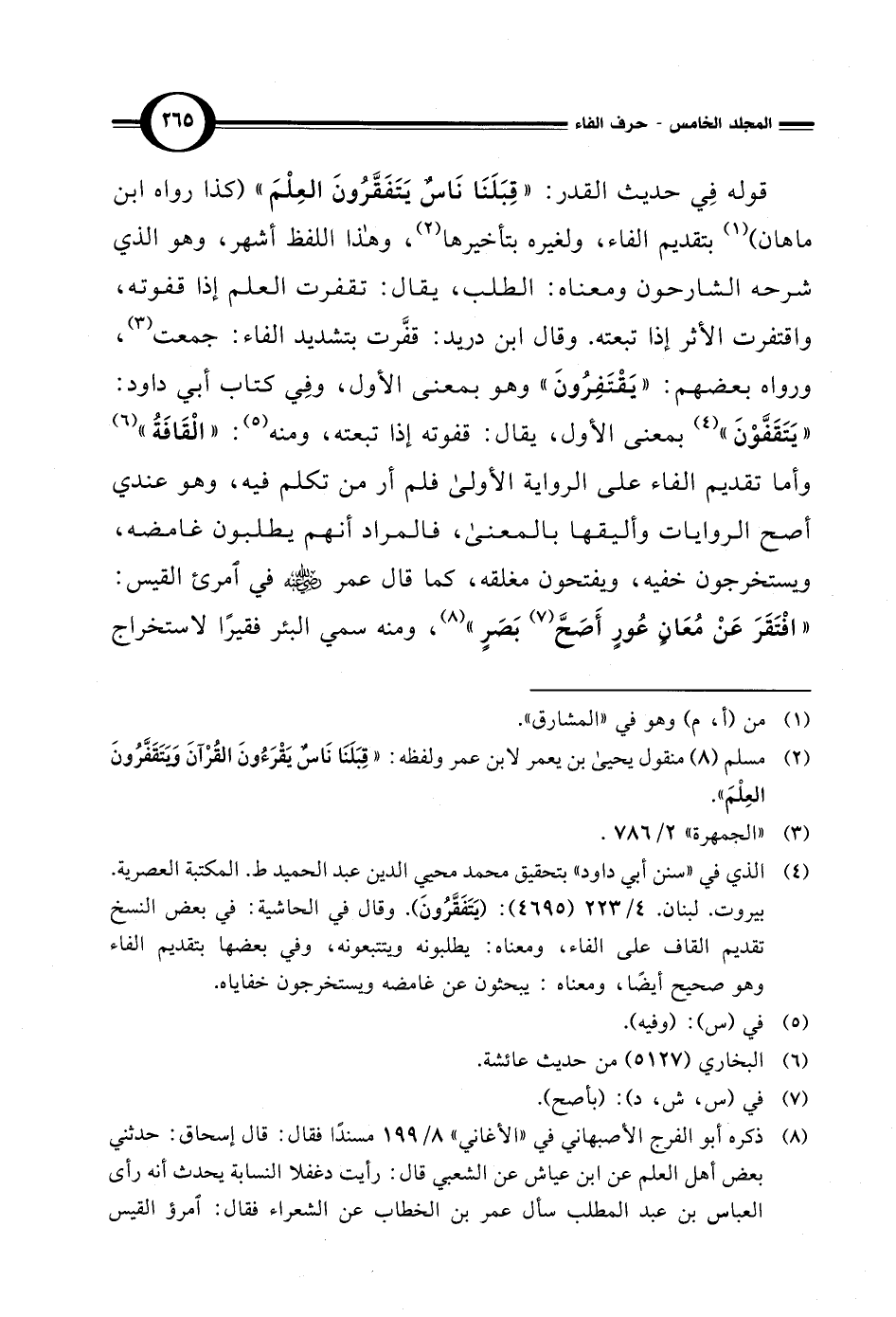 قوله في حديث القدر: "قِبَلَنَا ناسٌ يَتَفَقَّرُونَ العِلْمَ" (كذا رواه ابن ماهان) (¬1) بتقديم الفاء، ولغيره بتأخيرها (¬2)، وهذا اللفظ أشهر، وهو الذي شرحه الشارحون ومعناه: الطلب، يقال: تقفرت العلم إذا قفوته، واقتفرت الأثر إذا تبعته. وقال ابن دريد: قفَّرت بتشديد الفاء: جمعت (¬3)، ورواه بعضهم: "يَقْتَفِرُونَ" وهو بمعنى الأول، وفِي كتاب أبي داود: "يَتَقَفَّوْنَ" (¬4) بمعنى الأول، يقال: قفوته إذا تبعته، ومنه (¬5): "الْقَافَةُ" (¬6) وأما تقديم الفاء على الرواية الأولى فلم أر من تكلم فيه، وهو عندي أصح الروايات وأليقها بالمعنى، فالمراد أنهم يطلبون غامضه، ويستخرجون خفيه، ويفتحون مغلقه، كما قال عمر - رضي الله عنه - في امرئ القيس: "افْتَقَرَ عَنْ مُعَانٍ عُورٍ أَصَحَّ (¬7) بَصَرٍ" (¬8)، ومنه سمي البئر فقيرًا لاستخراج