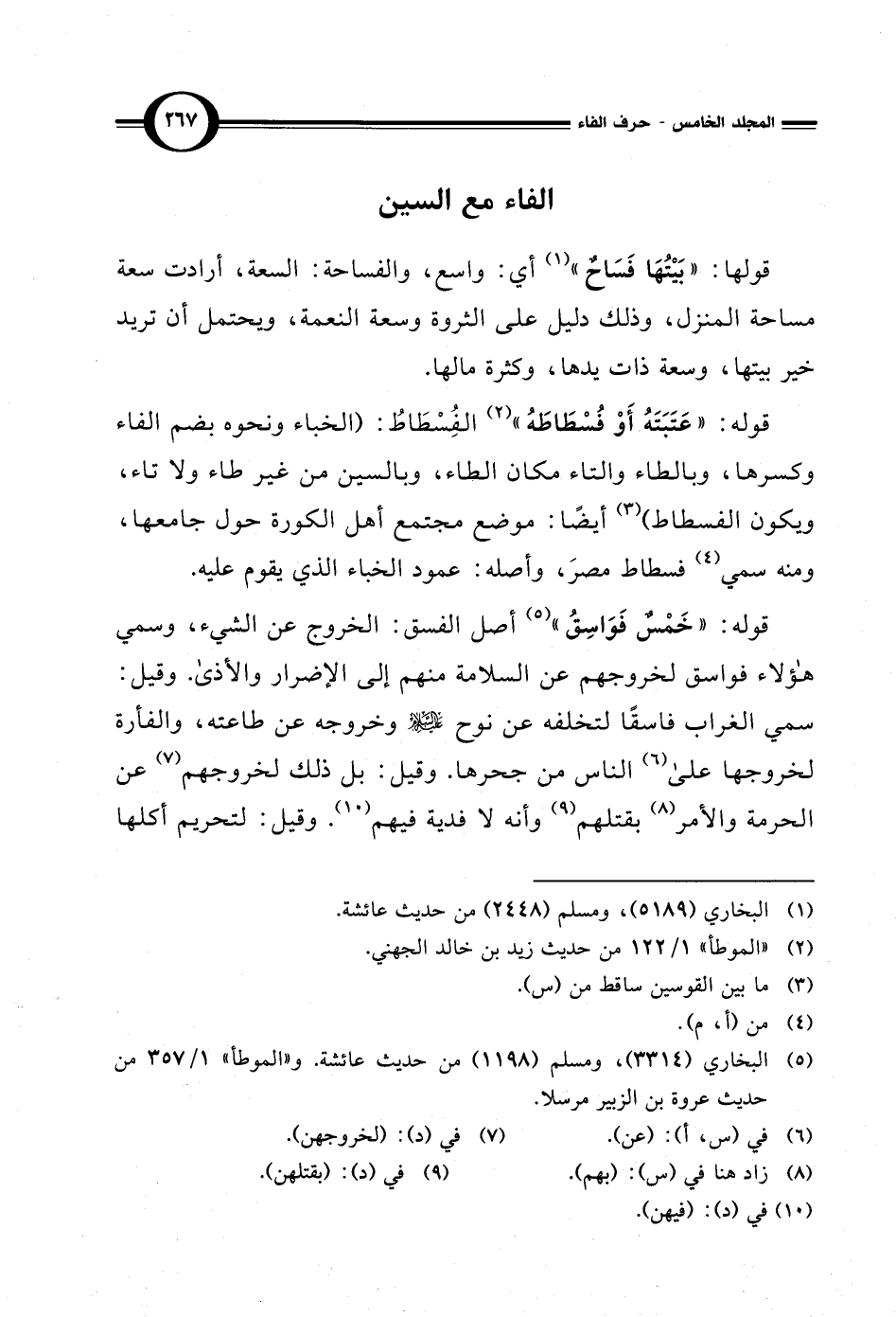 قوله: "عَتَبَتَهُ أَوْ فُسْطَاطَهُ" (¬2) الفُسْطَاطُ: (الخباء ونحوه بضم الفاء وكسرها، وبالطاء والتاء مكان الطاء، وبالسين من غير طاء ولا تاء، ويكون الفسطاط) (¬3) أيضًا: موضع مجتمع أهل الكورة حول جامعها، ومنه سمي (¬4) فسطاط مصرَ، وأصله: عمود الخباء الذي يقوم عليه.