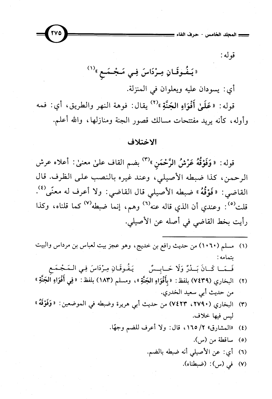 قوله: "وَفَوْقُهُ عَرْشُ الرَّحْمَنِ" (¬3) بضم القاف على معنى: أعلاه عرش الرحمن، كذا ضبطه الأصيلي، وعند غيره بالنصب على الظرف. قال القاضي: "فَوْقُهُ" ضبطه الأصيلي قال القاضي: ولا أعرف له معنًى (¬4).