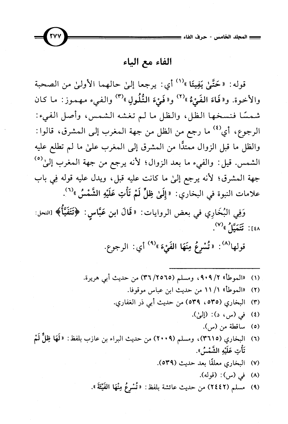 قوله: "حَتَّى يَفِيئَا" (¬1) أي: يرجعا إلى حالهما الأولى من الصحبة والأخوة. و"فَاءَ الفَيْءُ" (¬2) و"فَيْءَ التُّلُولِ" (¬3) والفيء مهموز: ما كان شمسًا فنسخها الظل، والظل ما لم تغشه الشمس، وأصل الفيء: الرجوع، أي (¬4) ما رجع من الظل من جهة المغرب إِلَى المشرق، قالوا: والظل ما قبل الزوال ممتدًّا من المشرق إِلَى المغرب على ما لم تطلع عليه الشمس. قيل: والفيء ما بعد الزوال؛ لأنه يرجع من جهة المغرب إِلَى (¬5) جهة المشرق؛ لأنه يرجع إِلَى ما كانت عليه قبل، ويدل عليه قوله في باب علامات النبوة في البخاري: "إِلَى ظِلٍّ لَمْ تَأْتِ عَلَيْهِ الشَّمْسُ" (¬6).