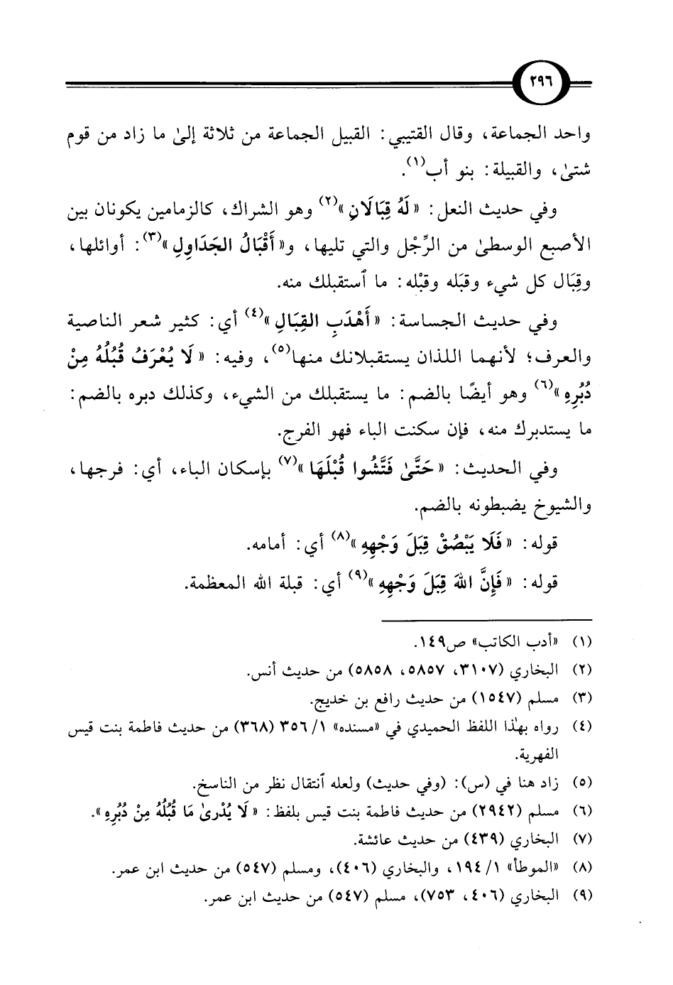وفي حديث الجساسة: "أَهْدَبِ القِبَالِ" (¬4) أي: كثير شعر الناصية والعرف؛ لأنهما اللذان يستقبلانك منها (¬5)، وفيه: "لَا يُعْرَفُ قُبُلُهُ مِنْ دُبُرِهِ" (¬6) وهو أيضًا بالضم: ما يستقبلك من الشيء، وكذلك دبره بالضم: ما يستدبرك منه، فإن سكنت الباء فهو الفرج.