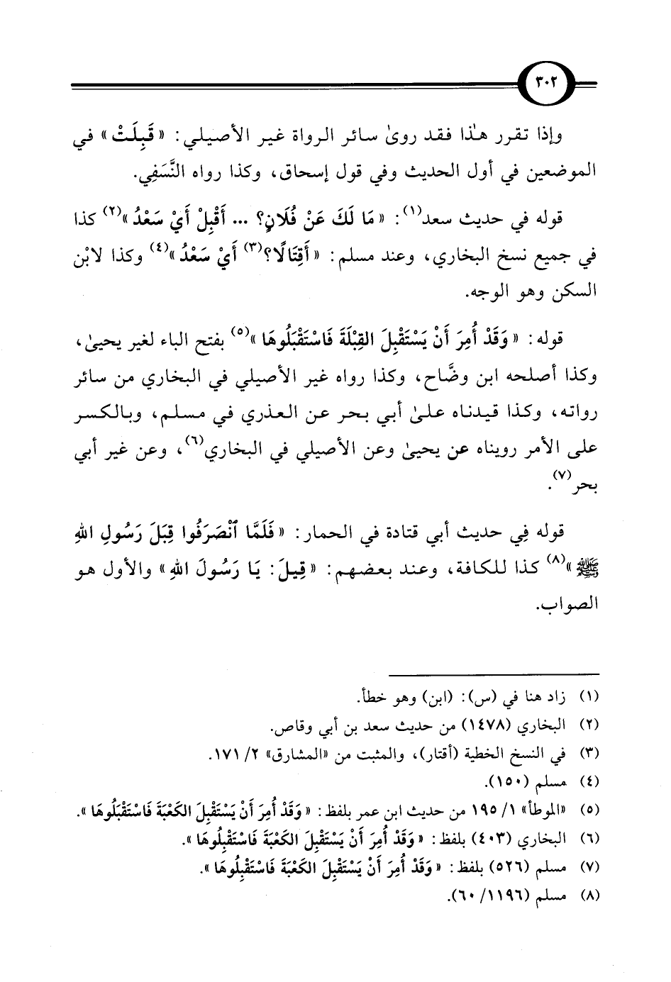 قوله في حديث أبي قتادة في الحمار: "فَلَمَّا انْصَرَفُوا قِبَلَ رَسُولِ اللهِ - صلى الله عليه وسلم - " (¬8) كذا للكافة، وعند بعضهم: "قِيلَ: يَا رَسُولَ اللهِ" والأول هو الصواب.