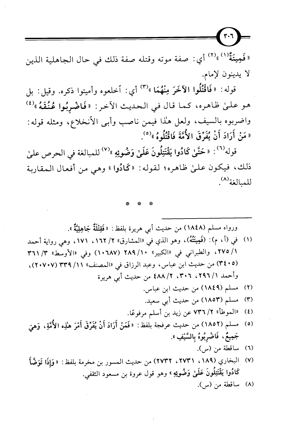 (¬5) مسلم (1852) من حديث عرفجة بلفظ: "فَمَنْ أَرَادَ أَنْ يُفَرِّقَ أَمْرَ هذه الأُمَّةِ، وَهيَ جَمِيعٌ، فَاضْرِبُوهُ بِالسَّيْفِ".