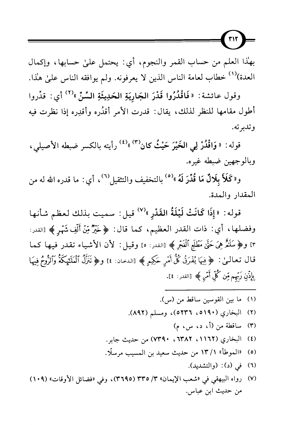 وقول عائشة: "فَاقْدُرُوا قَدْرَ الجَارِيَةِ الحَدِيثَةِ السِّنِّ" (¬2) أي: قدِّروا أطول مقامها للنظر لذلك، يقال: قدرت الأمر أقدُره وأقدِره إذا نظرت فيه وتدبرته.