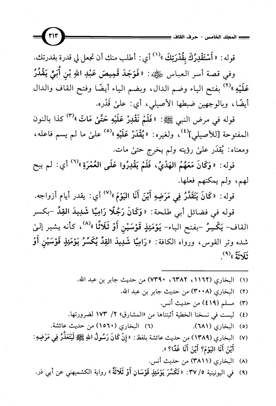 وفي قصة أسر العباس - رضي الله عنه -: "فَوَجَدَ قَمِيصَ عَبْدِ اللهِ بْنِ أُبَيٍّ يَقْدُرُ عَلَيْهِ" (¬2) بفتح الياء وضم الدال، وبضم الياء أيضًا وفتح القاف والدال أيضًا، وبالوجهين ضبطها الأصيلي، أي: على قَدْره.