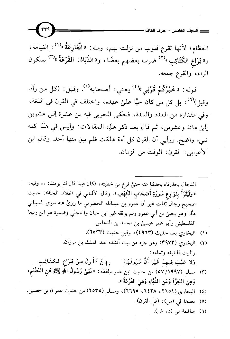 وقيل) (¬6): بل كل من كان حيًّا على عهده، واختلف في القرن في اللغة، وفي مقداره من العدد والمدة، فحكى الحربي فيه من عشرة إلى عشرين إلى مائة وعشرين، ثم قال بعد ذكر هذه المقالات: وليس في هذا كله شيء واضح. ورأيي أن القرن كل أمة هلكت فلم يبق منها أحد. وقال ابن الأعرابي: القرن: الوقت من الزمان.