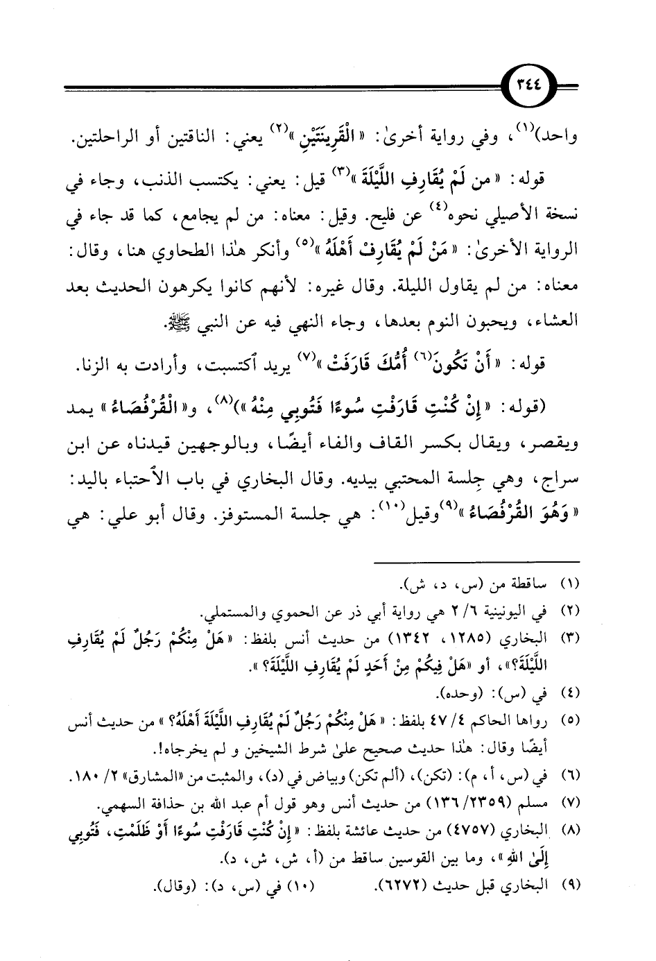 قوله: "من لَمْ يُقَارِفِ اللَّيْلَةَ" (¬3) قيل: يعني: يكتسب الذنب، وجاء في نسخة الأصيلي نحوه (¬4) عن فليح. وقيل: معناه: من لم يجامع، كما قد جاء في الرواية الأخرى: "مَنْ لَمْ يُقَارِفْ أَهْلَهُ" (¬5) وأنكر هذا الطحاوي هنا، وقال: معناه: من لم يقاول الليلة. وقال غيره: لأنهم كانوا يكرهون الحديث بعد العشاء، ويحبون النوم بعدها، وجاء النهي فيه عن النبي - صلى الله عليه وسلم -.