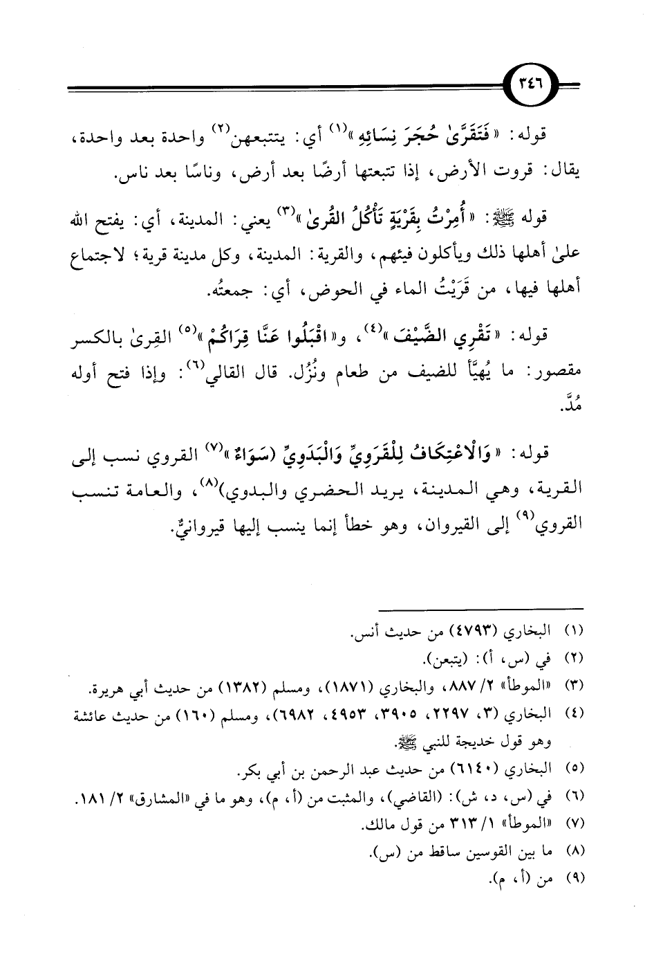 قوله: "وَالْاعْتِكَافُ لِلْقَرَوِيِّ وَالْبَدَوِيِّ (سَوَاءٌ" (¬7) القروي نسب إلى القرية، وهي المدينة، يريد الحضري والبدوي) (¬8)، والعامة تنسب القروي (¬9) إلى القيروان، وهو خطأ إنما ينسب إليها قيروانيٌّ.