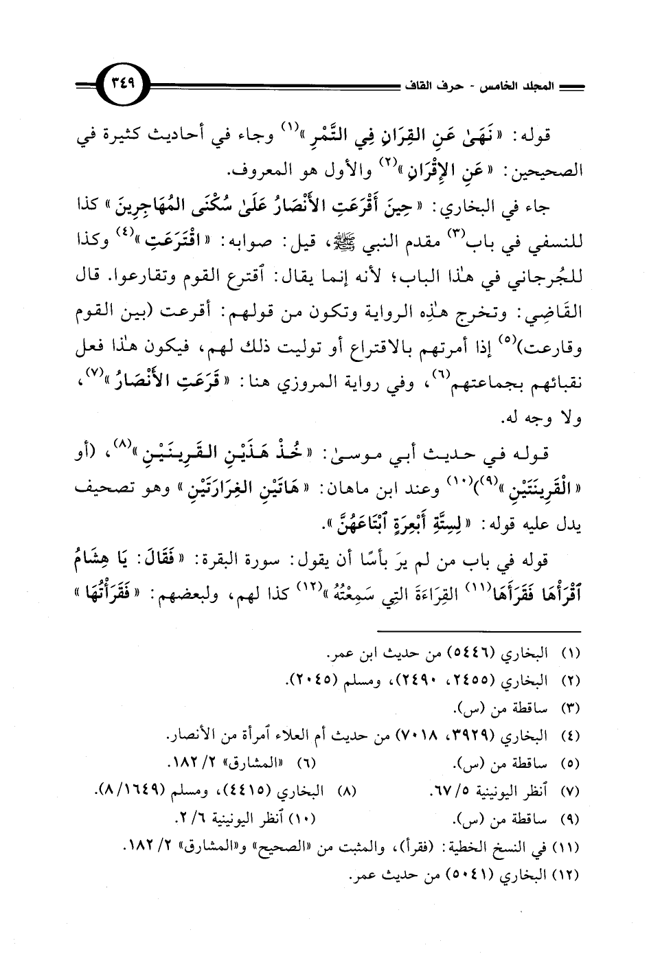 قوله: "نَهَى عَنِ القِرَانِ فِي التَّمْرِ" (¬1) وجاء في أحاديث كثيرة في الصحيحين: "عَنِ الإِقْرَانِ" (¬2) والأول هو المعروف.