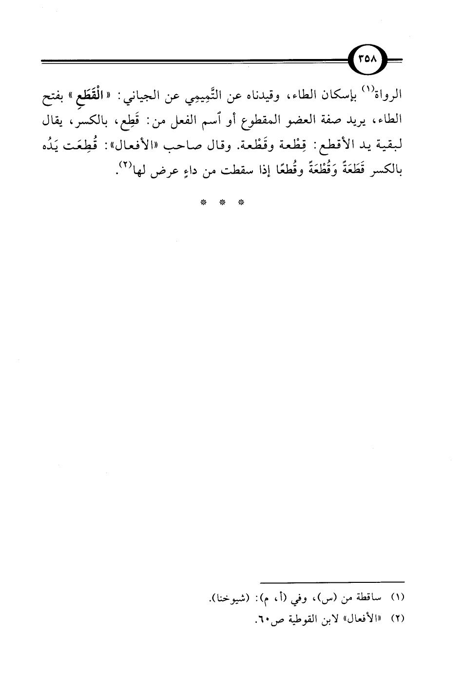 الرواة (¬1) بإسكان الطاء، وقيدناه عن التَّمِيمِي عن الجياني: "الْقَطَعِ" بفتح الطاء، يريد صفة العضو المقطوع أو اسم الفعل من: قَطِع، بالكسر، يقال لبقية يد الأقطع: قِطْعة وقَطْعة. وقال صاحب "الأفعال": قُطِعَت يَدُه بالكسر قَطَعَةً وَقُطْعَةً وقُطعًا إذا سقطت من داءٍ عرض لها (¬2).