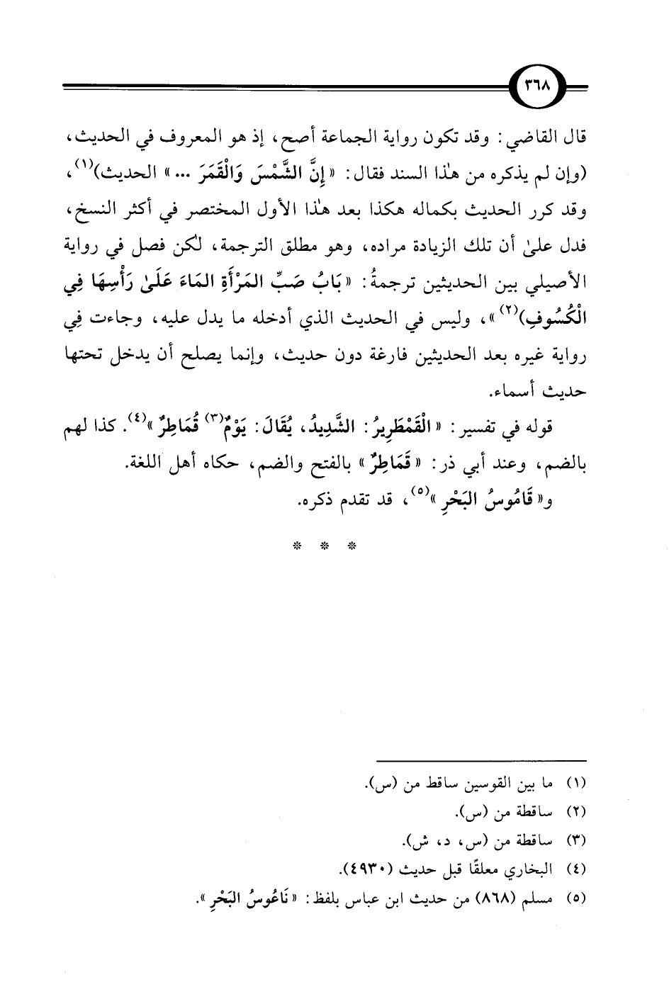 قال القاضي: وقد تكون رواية الجماعة أصح، إذ هو المعروف في الحديث، (وإن لم يذكره من هذا السند فقال: "إِنَّ الشَّمْسَ وَالْقَمَرَ ... " الحديث) (¬1)، وقد كرر الحديث بكماله هكذا بعد هذا الأول المختصر في أكثر النسخ، فدل علي أن تلك الزيادة مراده، وهو مطلق الترجمة، لكن فصل في رواية الأصيلي بين الحديثين ترجمةُ: "بَابُ صَبِّ المَرْأَةِ المَاءَ عَلَى رَأْسِهَا في الْكُسُوفِ) (¬2) "، وليس في الحديث الذي أدخله ما يدل عليه، وجاءت في رواية غيره بعد الحديثين فارغة دون حديث، وإنما يصلح أن يدخل تحتها حديث أسماء.