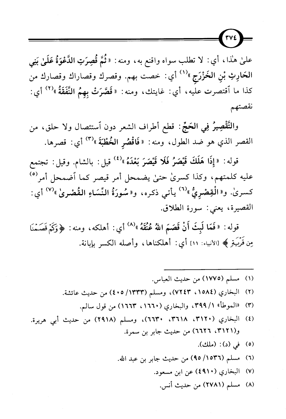 علي هذا، أي: لا تطلب سواه واقنع به، ومنه: "ثُمَّ قُصِرَتِ الدَّعْوَةُ عَلَى بَنِي الحَارِثِ بْنِ الخَزْرَجِ" (¬1) أي: خصت بهم. وقصرك وقصاراك وقصارك من كذا ما اقتصرت عليه، أي: غايتك، ومنه: "قَصَّرَتْ بِهِمُ النَّفَقَةُ" (¬2) أي: نقصتهم والتَّقْصِيرُ في الحَجِّ: قطع أطراف الشعر دون استئصال ولا حلق، من القصر الذي هو ضد الطول، ومنه: "فَاقْصُرِ الخُطْبَةَ" (¬3) أي: قصرها.