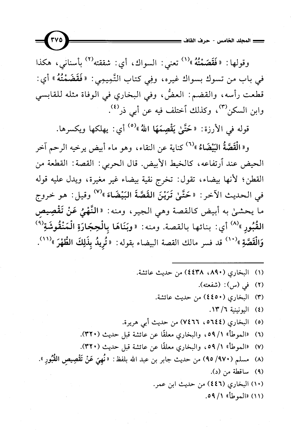 و"الْقَصَّةُ البَيْضَاءُ" (¬6) كناية عن النقاء، وهو ماء أبيض يرخيه الرحم آخر الحيض عند ارتفاعه، كالخيط الأبيض. قال الحربي: القصة: القطعة من القطن؛ لأنها بيضاء، تقول: تخرج نقية بيضاء غير مغيرة، ويدل عليه قوله في الحديث الآخر: "حَتَّى تَرَيْنَ القَصَّةَ البَيْضَاءَ" (¬7) وقيل: هو خروج ما يحشى به أبيض كالقصة وهي الجير، ومنه: "النَّهْيُ عَنْ تَقْصِيصِ القُبُورِ" (¬8) أي: بنائها بالقصة. ومنه: "وبَنَاهَا بِالْحِجَارَةِ الْمَنْقُوشَةِ (¬9) وَالْقَصَّةِ" (¬10) قد فسر مالك القصة البيضاء بقوله: "تُرِيدُ بِذَلِكَ الطُّهْرَ" (¬11).