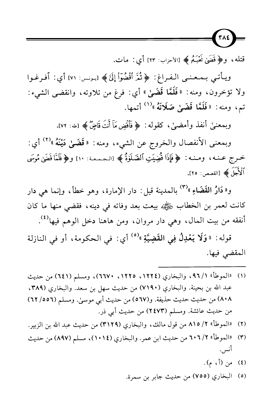 ويأتي بمعنى الفراغ: {ثُمَّ اقْضُوا إِلَيَّ} [يونس: 71] أي: افرغوا ولا تؤخرون، ومنه: "فَلَمَّا قَضَى" أي: فرغ من تلاوته، وانقضى الشيء: تم، ومنه: "فَلَمَّا قَضَى صَلَاتَهُ" (¬1) أتمها.
