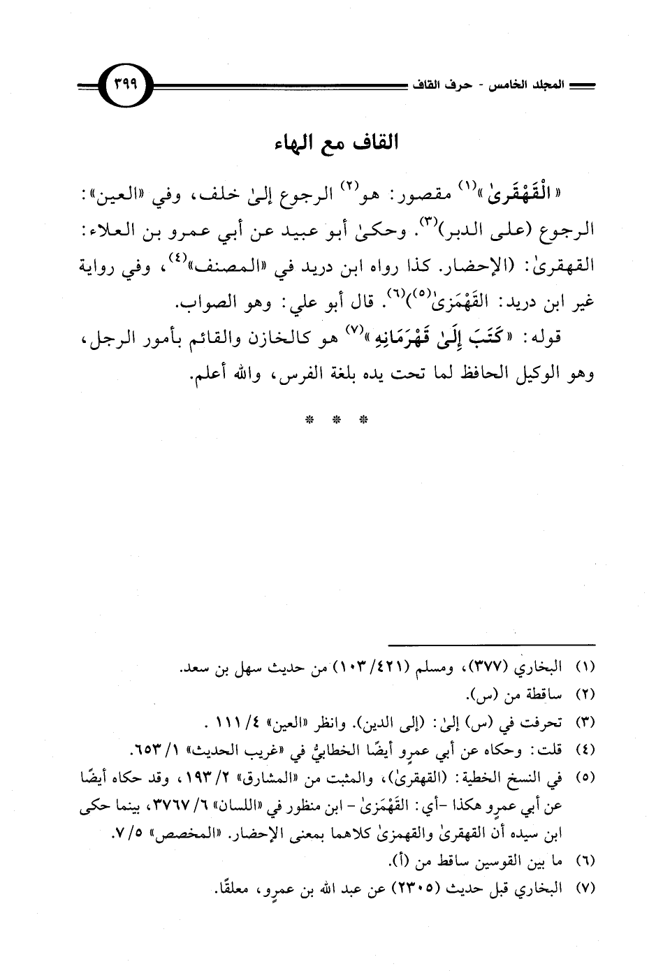 (¬5) في النسخ الخطية: (القهقري)، والمثبت من "المشارق" 2/ 193، وقد حكاه أيضًا عن أبي عمرو هكذا - أي: القَهْمَزي - ابن منظور في "اللسان" 6/ 3767، بينما حكى ابن سيده أن القهقري والقهمزى كلاهما بمعنى الإحضار. "المخصص" 5/ 7.