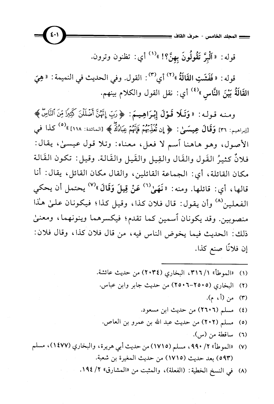 ومنه قوله: "وَتَلَا قَوْلَ إِبْرَاهِيمَ: {رَبِّ إِنَّهُنَّ أَضْلَلْنَ كَثِيرًا مِنَ النَّاسِ} [إبراهيم: 36] وَقَالَ عِيسَي: {إِنْ تُعَذِّبْهُمْ فَإِنَّهُمْ عِبَادُكَ} [المائدة: 118] (¬5) كذا في الأصول، وهو هاهنا اسم لا فعل، معناه: وتلا قول عيسى، يقال: فلانٌ كثيرُ القَول والقَال والقِيل والقَيل والقَالة. وقيل: تكون القَالة مكان القائلة، أي: الجماعة القائلين، والقال مكان القائل، يقال: أنا قالها، أي: قائلها. ومنه: "نَهَى (¬6) عَنْ قِيلَ وَقَالَ" (¬7) يحتمل أن يحكي الفعلين (¬8) وأن يقول: قال فلان كذا، وقيل كذا؛ فيكونان علي هذا منصوبين. وقد يكونان اسمين كما تقدم؛ فيكسرهما وينونهما، ومعنى ذلك: الحديث فيما يخوض الناس فيه، من قال فلان كذا، وقال فلان: إن فلانًا صنع كذا.