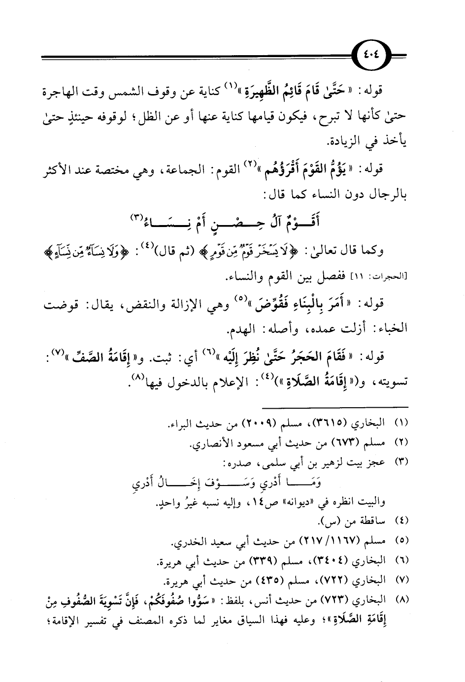 (¬8) البخاري (723) من حديث أنس، بلفظ: "سَوُّوا صُفُوفَكُمْ، فَإنَّ تَسْوِيَةَ الصُّفُوفِ مِنْ إِقَامَةِ الصَّلَاةِ"؛ وعليه فهذا السياق مغاير لما ذكره المصنف في تفسير الإقامة؛