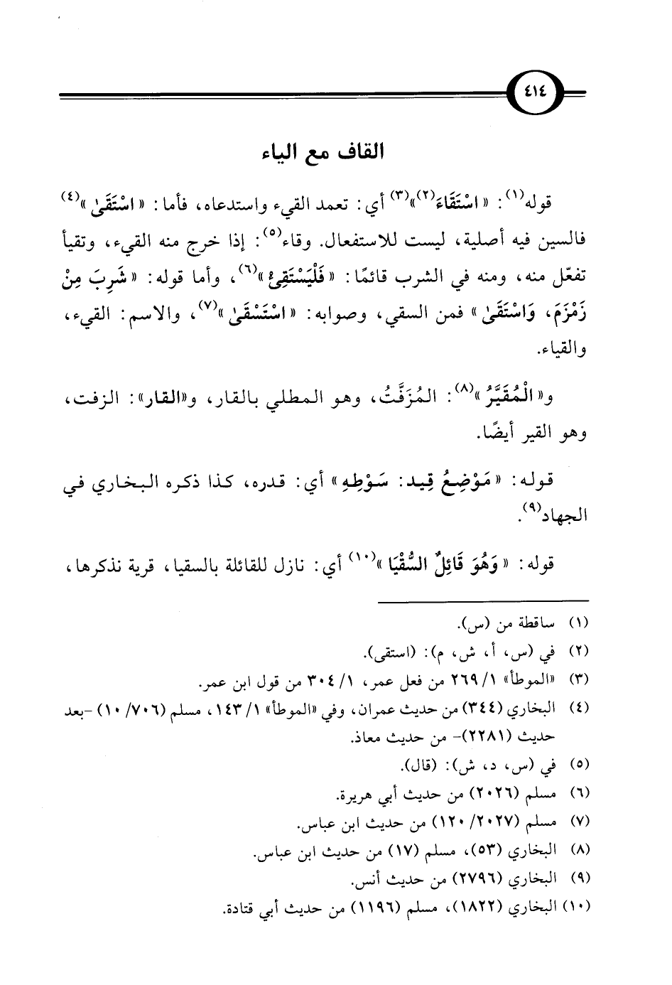 قوله (¬1): "اسْتَقَاءَ (¬2) " (¬3) أي: تعمد القيء واستدعاه، فأما: "اسْتَقَى" (¬4) فالسين فيه أصلية، ليست للاستفعال. وقاء (¬5): إذا خرج منه القيء، وتقيأ تفعّل منه، ومنه في الشرب قائمًا: "فَلْيَسْتَقِئْ" (¬6)، وأما قوله: "شَرِبَ مِنْ زَمْزَمَ، وَاسْتَقَى" فمن السقي، وصوابه: "اسْتَسْقَى" (¬7)، والاسم: القيء، والقياء.