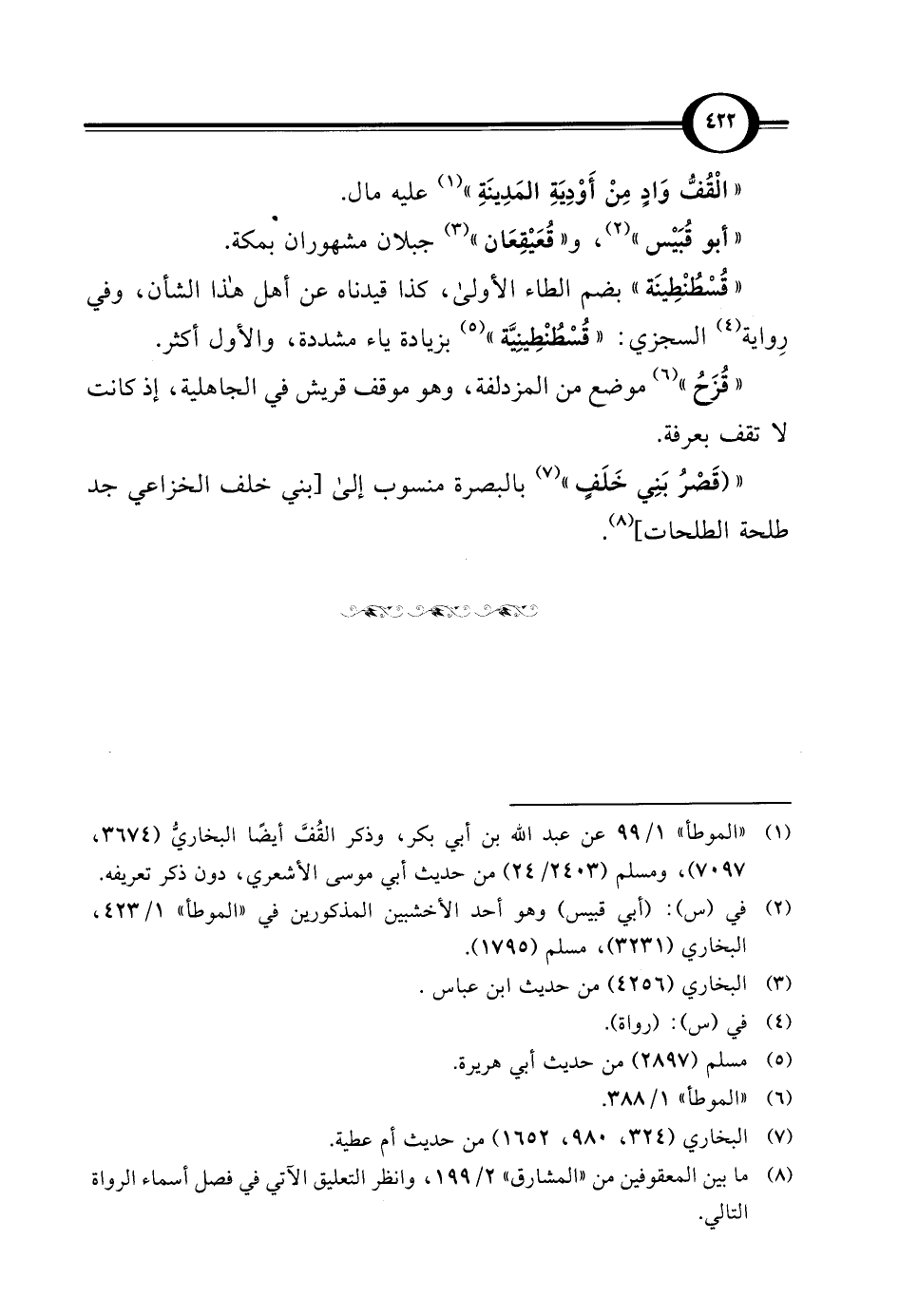 (¬1) "الموطأ" 1/ 99 عن عبد الله بن أبي بكر، وذكر القُفَّ أيضًا البخاريُّ (3674، 7097)، ومسلم (2403/ 24) من حديث أبي موسى الأشعري، دون ذكر تعريفه.
