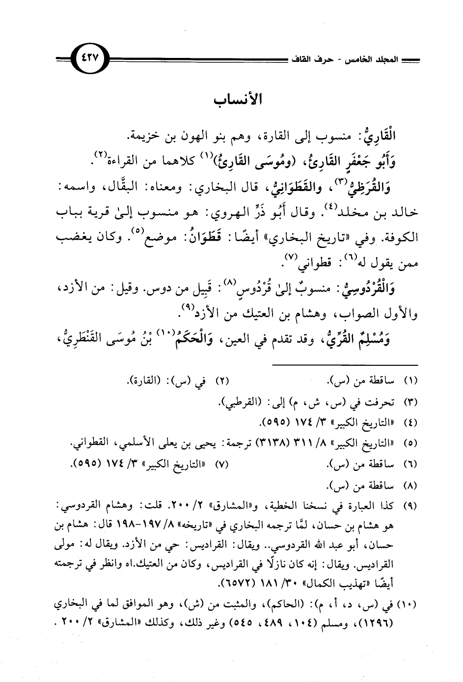 (¬9) كذا العبارة في نسخنا الخطية، و"المشارق" 2/ 200. قلت: وهشام القردوسي: هو هشام بن حسان، لمَّا ترجمه البخاري في "تاريخه" 8/ 197 - 198 قال: هشام بن حسان، أبو عبد الله القردوسي .. ويقال: القراديس: حي من الأزد. ويقال له: مولى القراديس. ويقال: إنه كان نازلًا في القراديس، وكان من العتيك. اهـ وانظر في ترجمته أيضًا "تهذيب الكمال" 30/ 181 (6572).