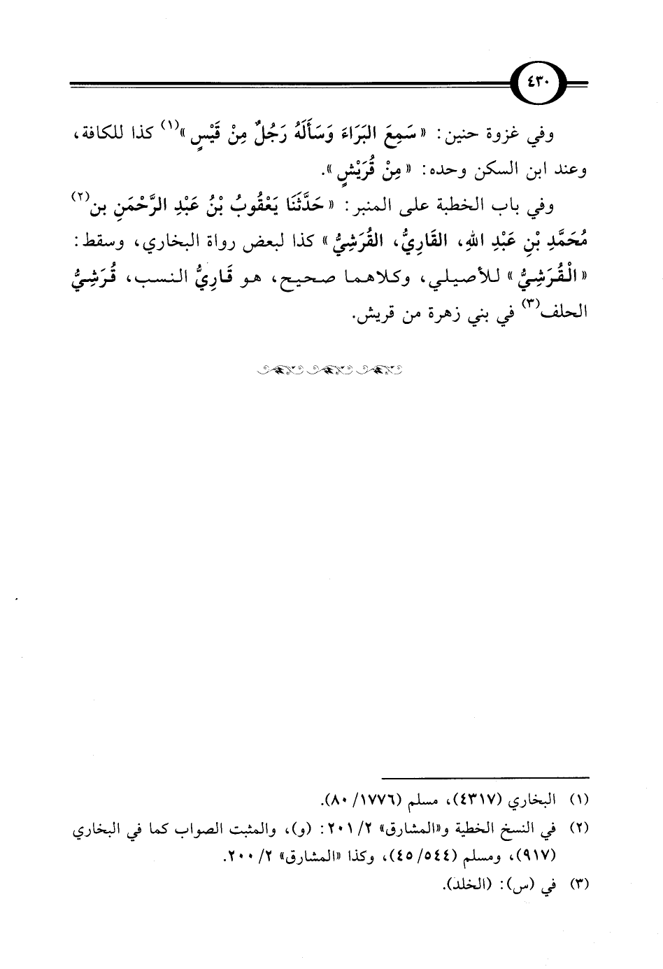 وفي غزوة حنين: "سَمِعَ البَرَاءَ وَسَأَلَهُ رَجُلٌ مِنْ قَيْسٍ" (¬1) كذا للكافة، وعند ابن السكن وحده: "مِنْ قُرَيْشٍ".