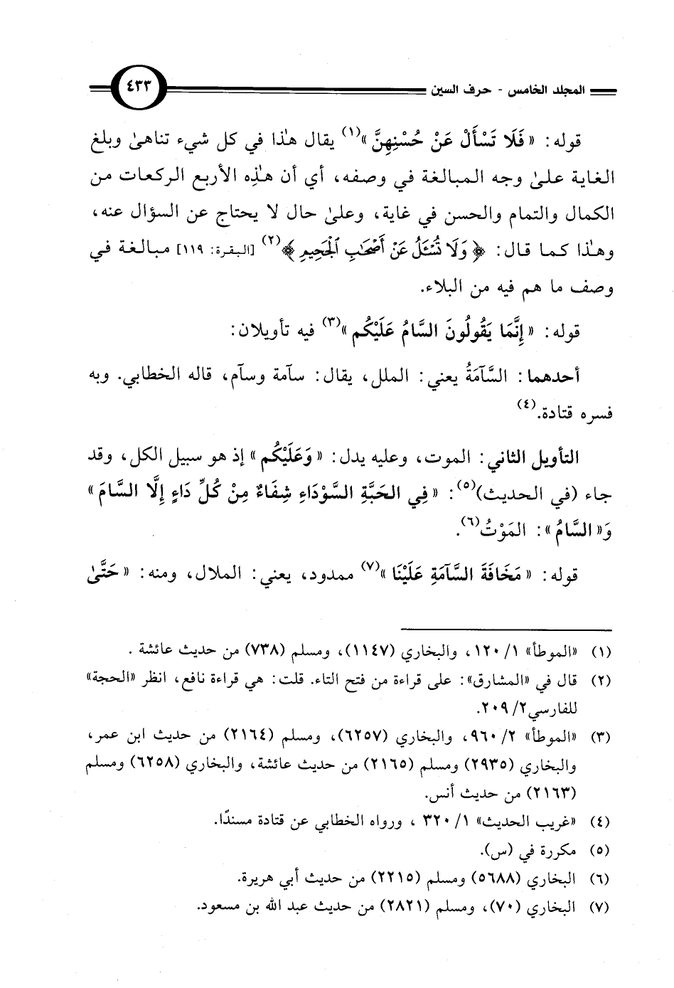 قوله: "إِنَّمَا يَقُولُونَ السَّامُ عَلَيْكُم" (¬3) فيه تأويلان: أحدهما: السَّآمَةُ يعني: الملل، يقال: سآمة وسآم، قاله الخطابي. وبه فسره قتادة. (¬4) التأويل الثاني: الموت، وعليه يدل: "وَعَلَيْكُم" إذ هو سبيل الكل، وقد جاء (في الحديث) (¬5): "في الحَبَّةِ السَّوْدَاءِ شِفَاءٌ مِنْ كُلِّ دَاءٍ إِلَّا السَّامَ" وَ"السَّامُ": المَوْتُ (¬6).