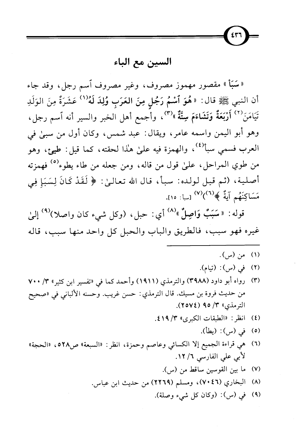 " سَبَأ" مقصور مهموز مصروف، وغير مصروف اسم رجل، وقد جاء أن النبي - صلى الله عليه وسلم - قال: "هُوَ اسْمُ رَجُلٍ مِنَ العَرَبِ وُلدَ لَهُ (¬1) عَشَرَةٌ مِنَ الوَلَدِ تَيَامَنَ (¬2) أَرْبَعَةٌ وَتَشَاءَمَ سِتَّةٌ" (¬3)، وأجمع أهل الخبر والسير أنه اسم رجل، وهو أبو اليمن واسمه عامر، ويقال: عبد شمس، وكان أول من سبى في العرب فسمي سبأ (¬4)، والهمزة فيه علا هذا لحقته، كما قيل: طيئ، وهو من طوي المراحل، على قول من قاله، ومن جعله من طاء يطوء (¬5) فهمزته أصلية، (ثم قيل لولده: سبأ، قال الله تعالى: {لَقَدْ كَانَ لِسَبَإٍ فِي مَسَاكَنِهِمْ آيَةٌ} (¬6)) (¬7) [سبأ: 15].
