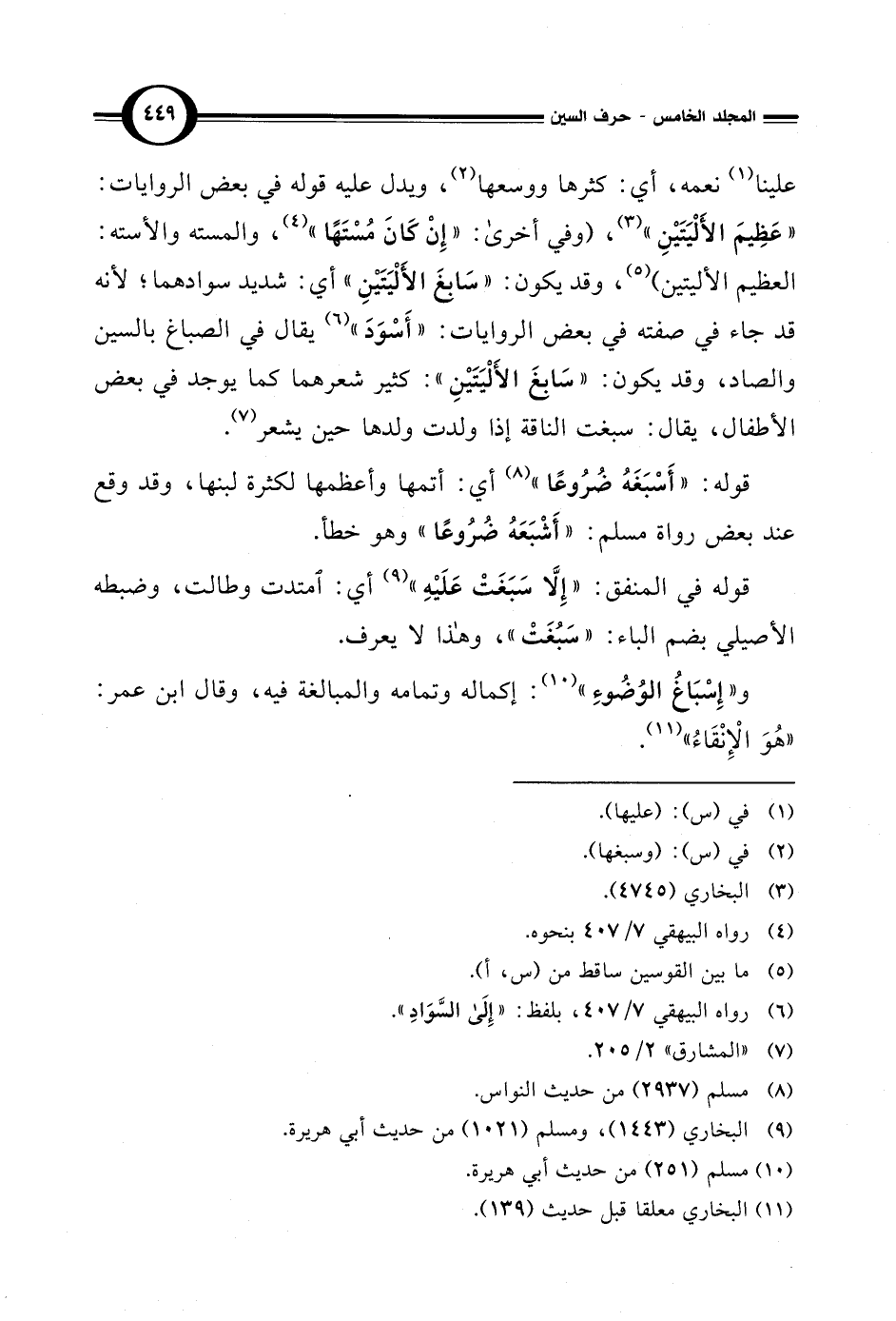 علينا (¬1) نعمه، أي: كثرها ووسعها (¬2)، ويدل عليه قوله في بعض الروايات: "عَظِيمَ الأَلْيَتَيْنِ" (¬3)، (وفي أخرى: "إِنْ كَانَ مُسْتَهًا" (¬4)، والمسته والأسته: العظيم الأليتين) (¬5)، وقد يكون: "سَابِغَ الأَلْيَتَيْنِ" أي: شديد سوادهما؛ لأنه قد جاء في صفته في بعض الروايات: "أَسْوَدَ" (¬6) يقال في الصباغ بالسين والصاد، وقد يكون: "سَابغَ الأَلْيَتَيْنِ": كثير شعرهما كما يوجد في بعض الأطفال، يقال: سبغت الناقة إذا ولدت ولدها حين يشعر (¬7).