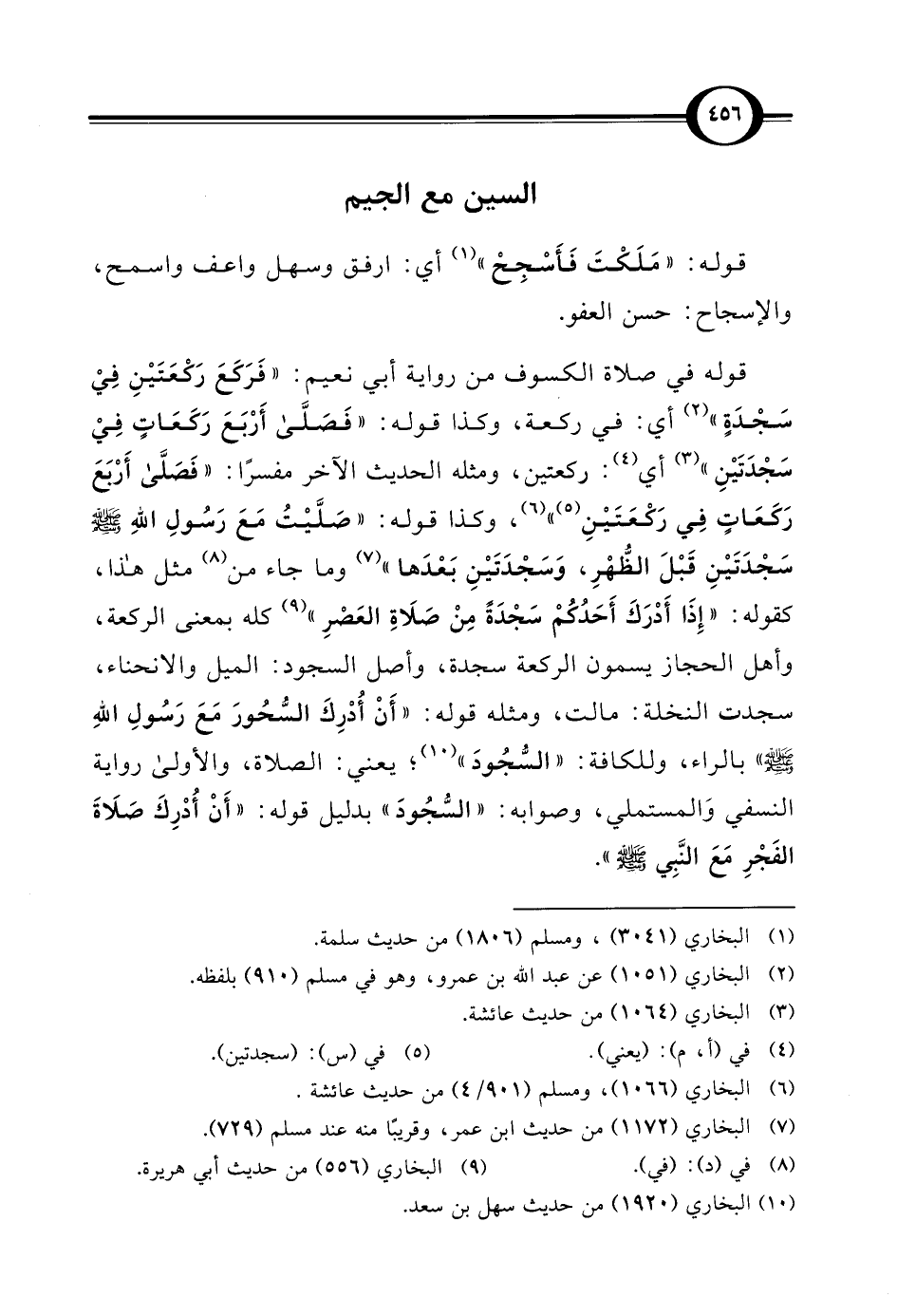 قوله في صلاة الكسوف من رواية أبي نعيم: "فَرَكَعَ رَكْعَتَيْنِ فِي سَجْدَةٍ" (¬2) أي: في ركعة، وكذا قوله: "فَصَلَّى أَرْبَعَ رَكعَاتٍ فِى سَجْدَتَيْنِ" (¬3) أي (¬4): ركعتين، ومثله الحديث الآخر مفسرًا: "فَصَلَّى أَرْبَعَ رَكَعَاتٍ في رَكْعَتَيْنِ (¬5) " (¬6)، وكذا قوله: "صَلَّيْتُ مَعَ رَسُولِ اللهِ - صلى الله عليه وسلم - سَجْدَتَيْنِ قَبْلَ الظُّهْرِ، وَسَجْدَتَيْنِ بَعْدَها" (¬7) وما جاء من (¬8) مثل هذا، كقوله: "إِذَا أَدْرَكَ أَحَدُكُمْ سَجْدَةً مِنْ صَلَاةِ العَصْرِ" (¬9) كله بمعنى الركعة، وأهل الحجاز يسمون الركعة سجدة، وأصل السجود: الميل والانحناء، سجدت النخلة: مالت، ومثله قوله: "أَنْ أُدْرِكَ السّحُورَ مَعَ رَسُولِ اللهِ - صلى الله عليه وسلم -" بالراء، وللكافة: "السُّجُودَ" (¬10)؛ يعني: الصلاة، والأولى رواية النسفي وَالمستملي، وصوابه: "السُّجُودَ" بدليل قوله: "أَنْ أُدْرِكَ صَلَاةَ الفَجْرِ مَعَ النَّبِي - صلى الله عليه وسلم -".