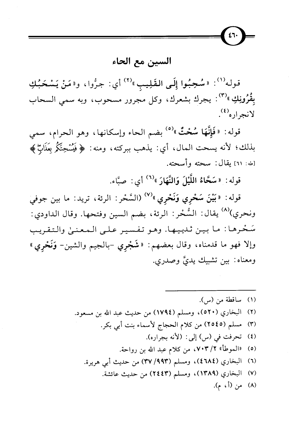 قوله (¬1): "سُحِبُوا إِلَى القَلِيبِ" (¬2) أي: جرُّوا، و"مَنْ يَسْحَبُكِ بِقُرُونِكِ" (¬3): يجرك بشعرك، وكل مجرور مسحوب، وبه سمي السحاب لانجراره (¬4).